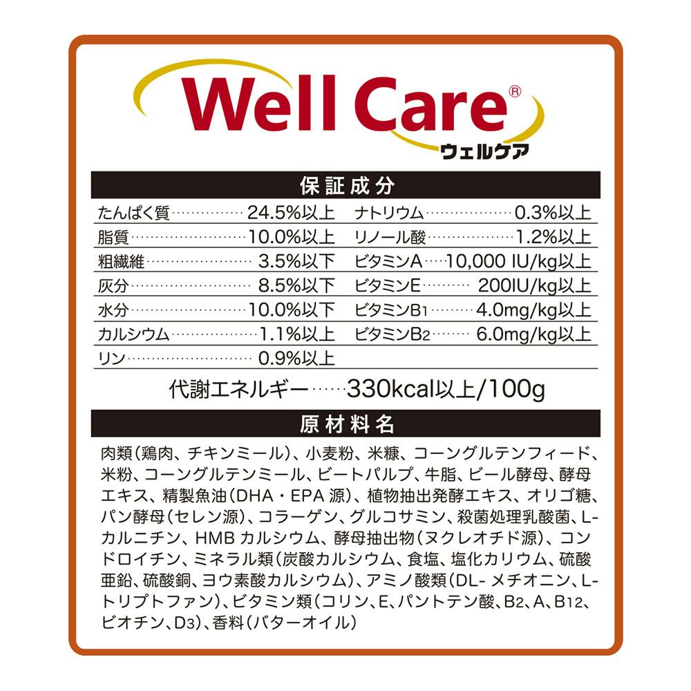 節と筋肉の健康維持に配慮し、コラーゲン、グルコサミン、コンドロイチン、HMBカルシウムを配合。また犬種特性に合わせたトータルケアのために、体重管理(低脂肪*設計)にも配慮。*低脂肪:ウェルケアチワワ専用アダルト~シニア比-9%