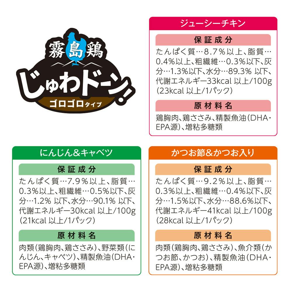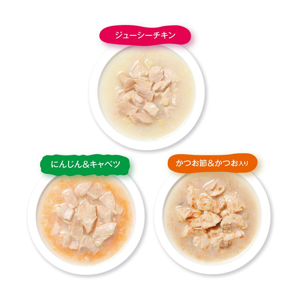 【ジューシーチキン】鶏胸肉、鶏ささみ、精製魚油(DHA・EPA源)、増粘多糖類【にんじん&キャベツ】肉類(鶏胸肉、鶏ささみ)、野菜類(にんじん、キャベツ)、精製魚油(DHA・EPA源)、増粘多糖類【かつお節&かつお入り】肉類(鶏胸肉、鶏ささみ)、魚介類(か