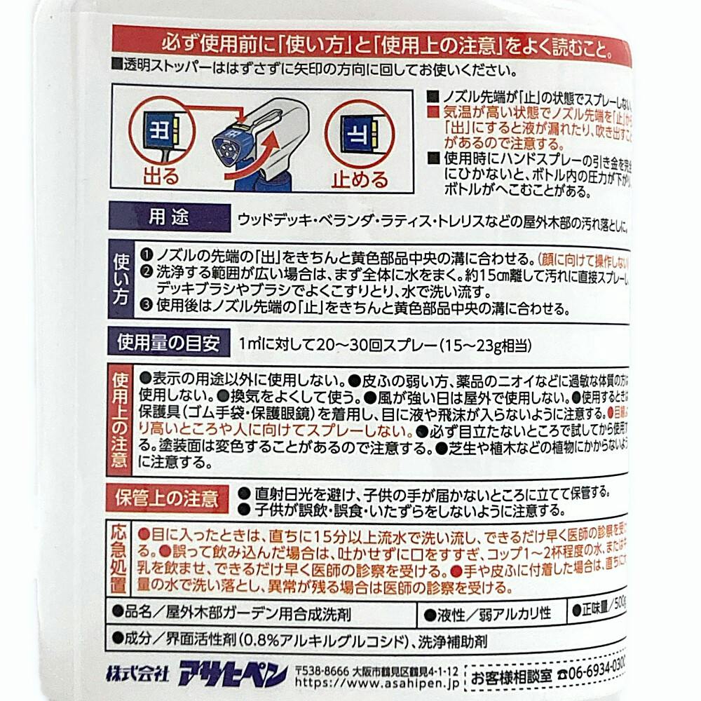 ●ノズルの先端の「出」をきちんと黄色部品中央の溝に合わせる。(顔に向けて操作しない)●洗浄する範囲が広い場合は、まず全体に水をまく。●約15cm離して汚れに直接スプレーし、デッキブラシやブラシでよくこすりとり、水で洗い流す。