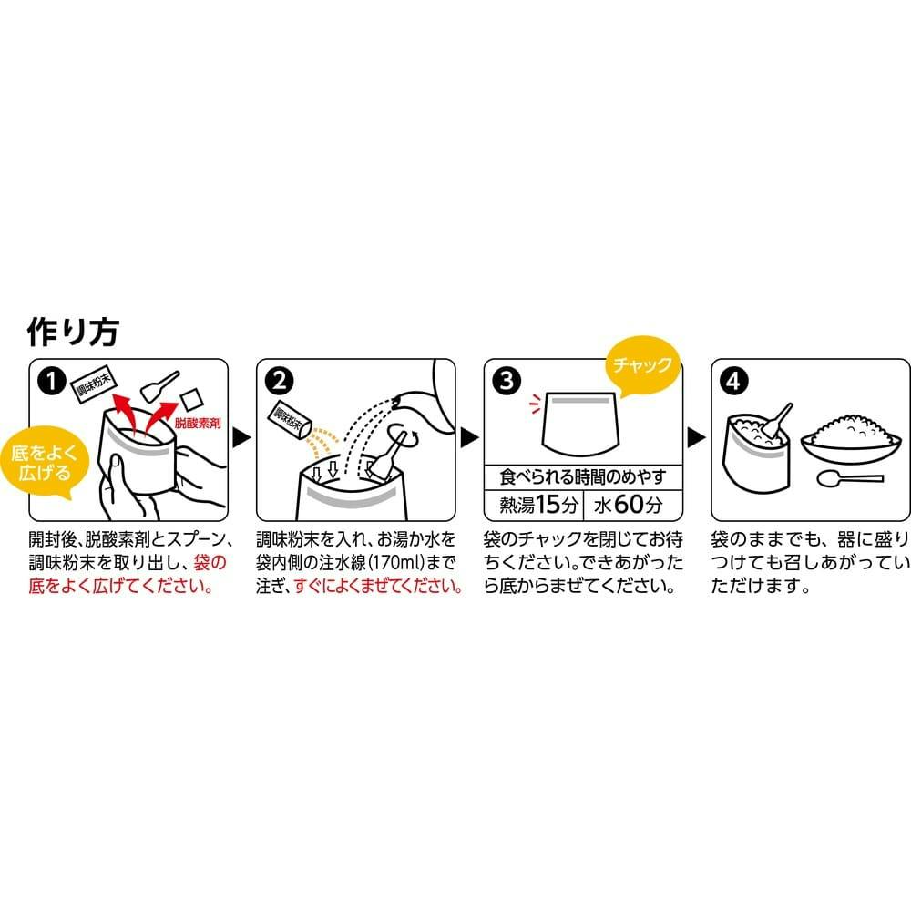 1.開封後、脱酸素剤とスプーン、調味粉末を取り出し、袋の底をよく広げてください。2.調味粉末を入れ、お湯か水を袋内側注水線(170ml)まで注ぎ、すぐによくまぜてください。 3.袋のチャックを閉じてお待ちください。(熱湯で約15分、水(約20℃)で約60分)