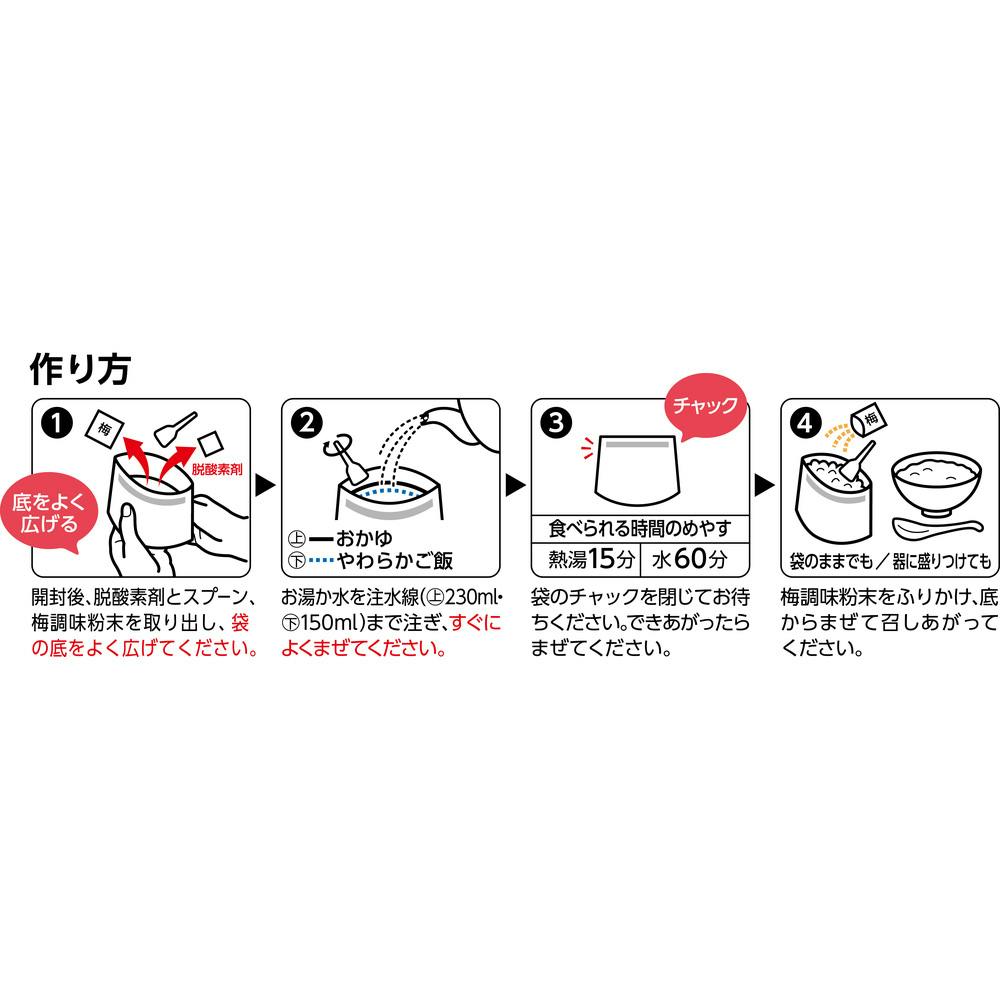 1.開封後、脱酸素剤とスプーン、梅調味粉末を取り出し、袋の底をよく広げてください。2.お湯か水を注水線(㊤おかゆ:230ml・㊦やわらかご飯:150ml) まで注ぎ、すぐによくまぜてください。3.袋のチャックを閉じてお待ちください。できあがったら まぜてください。