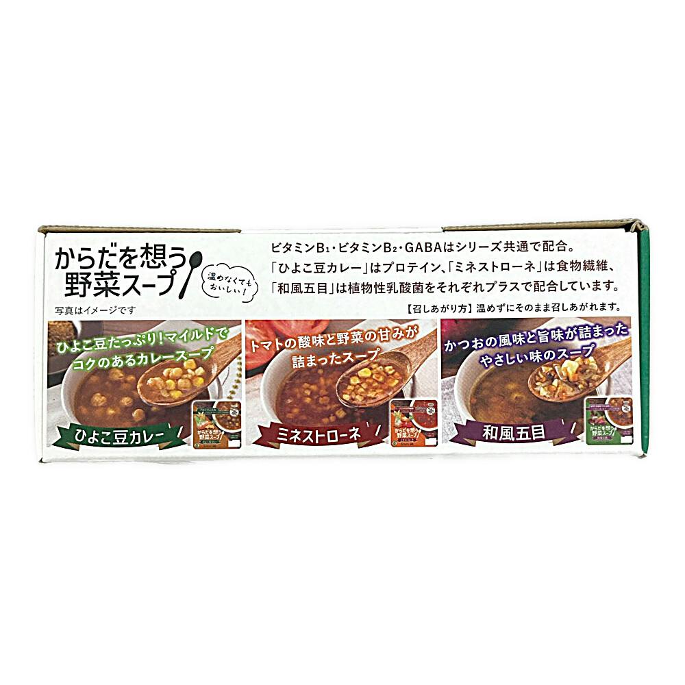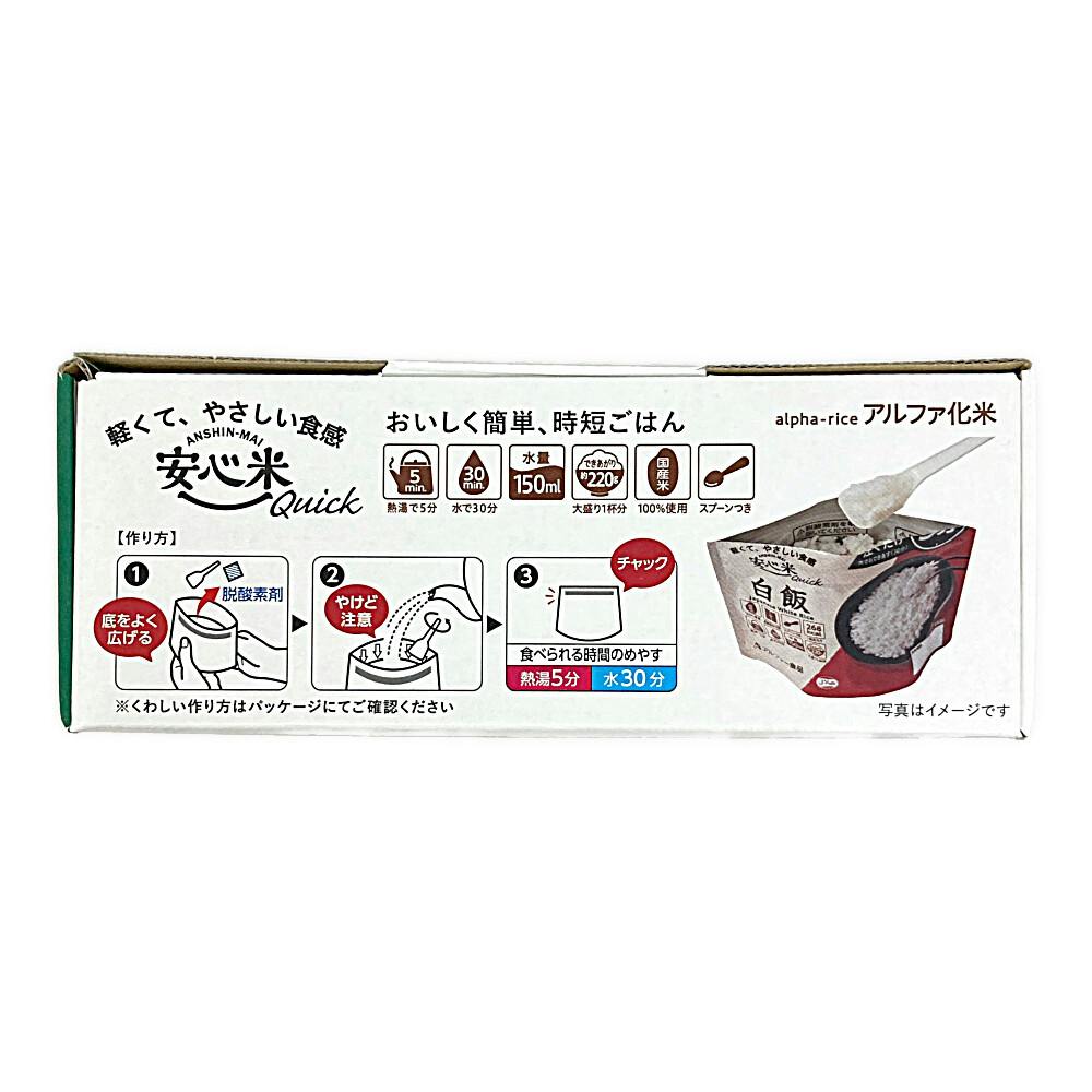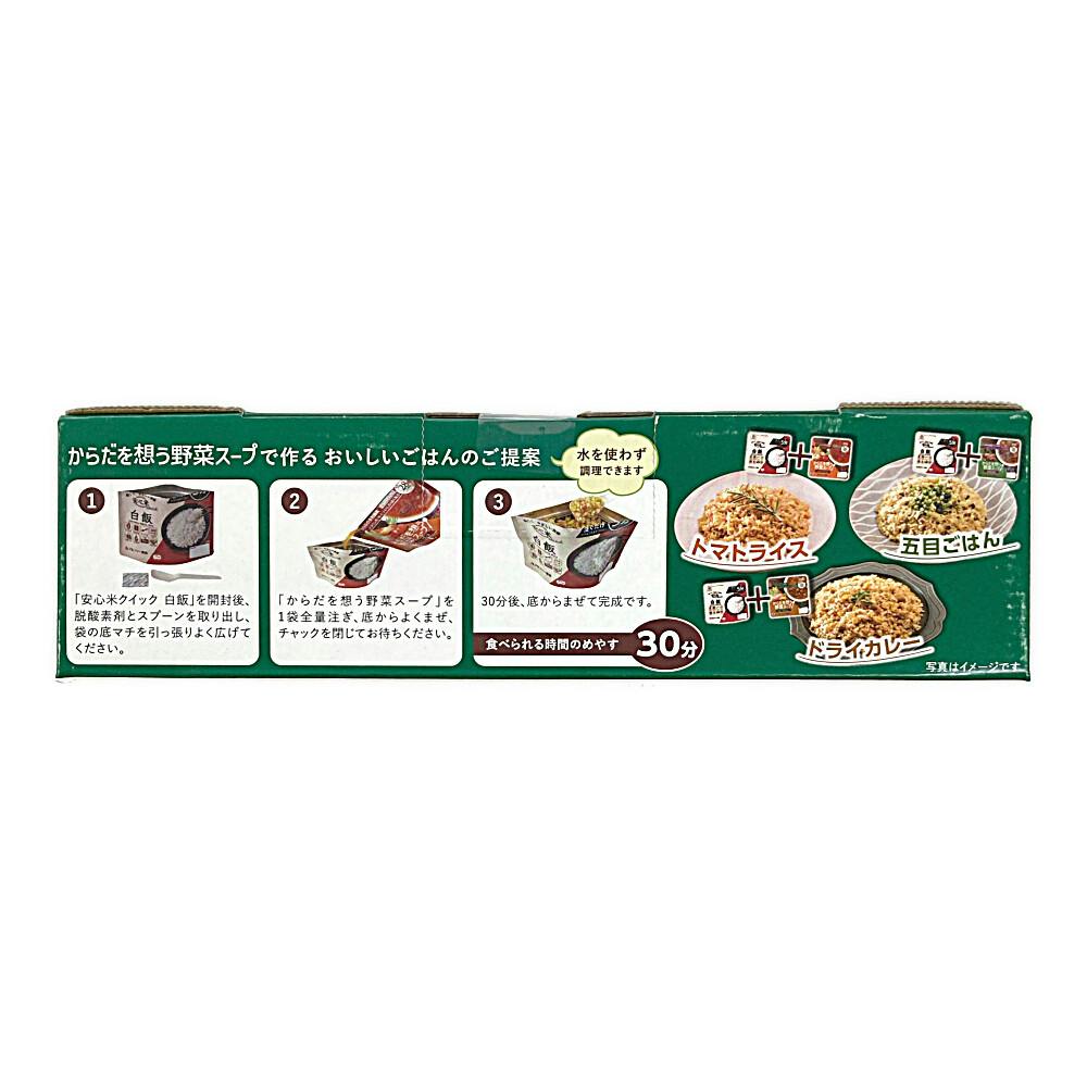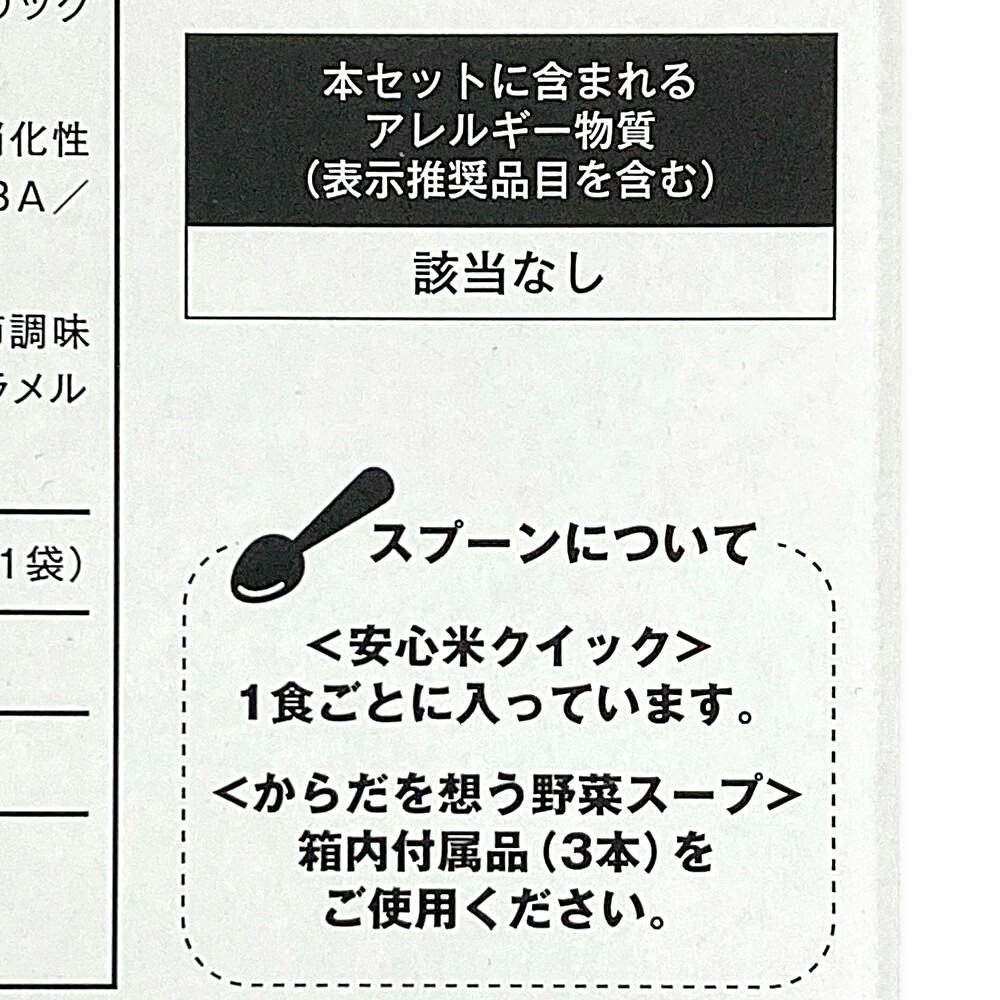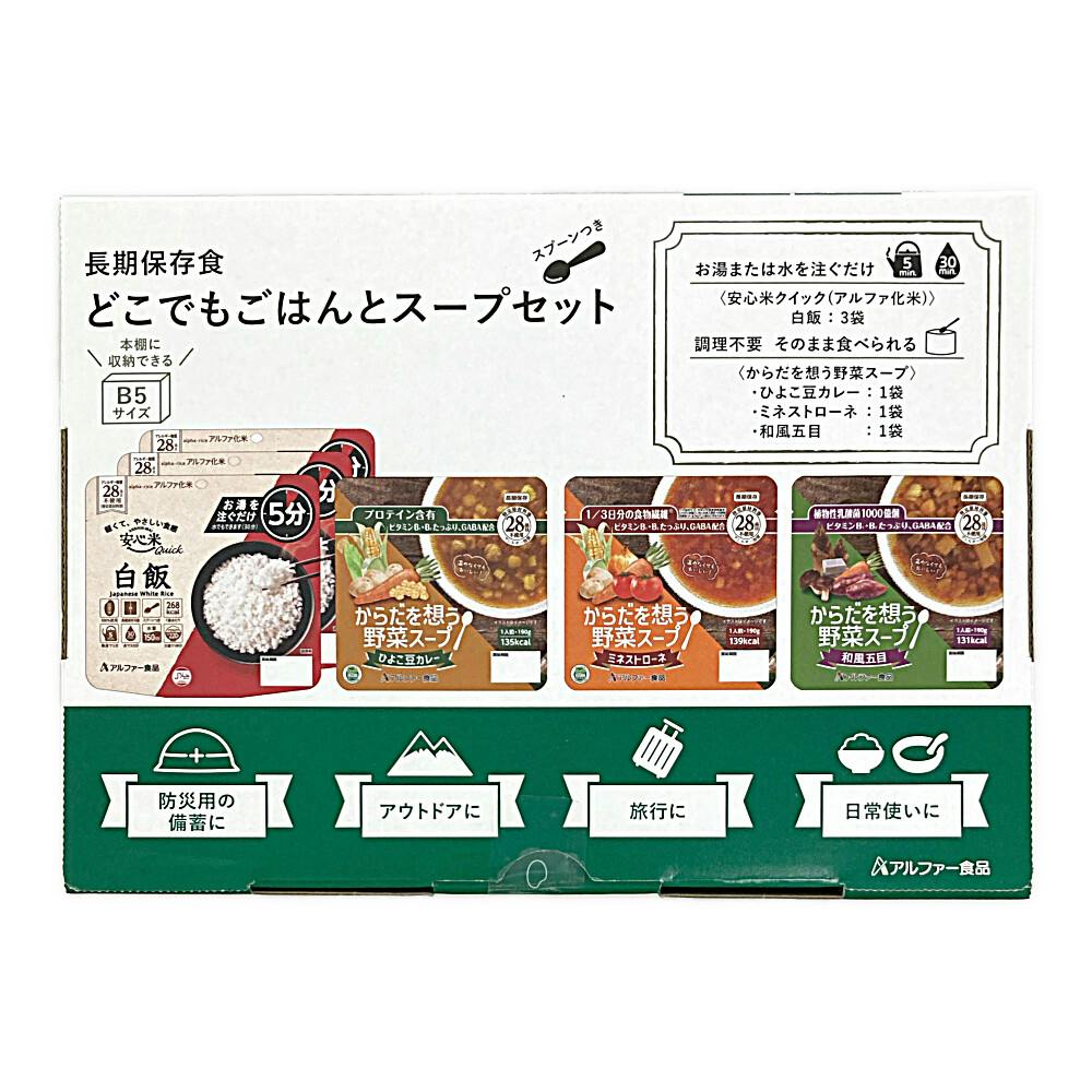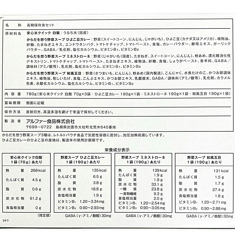 セット内容:安心米クイック(アルファ化米)/白飯:3袋+からだを想う野菜スープ/ひよこ豆カレー:1袋+ミネストローネ:1袋+和風五目:1袋+スプーン
