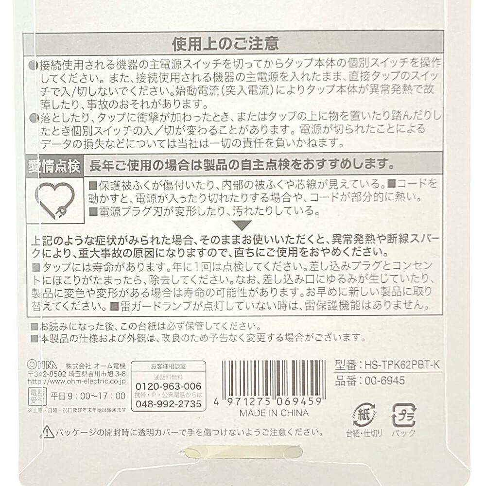 電源タップ 雷ガード 6個口 2m 黒 HS-TPK62PBT-K