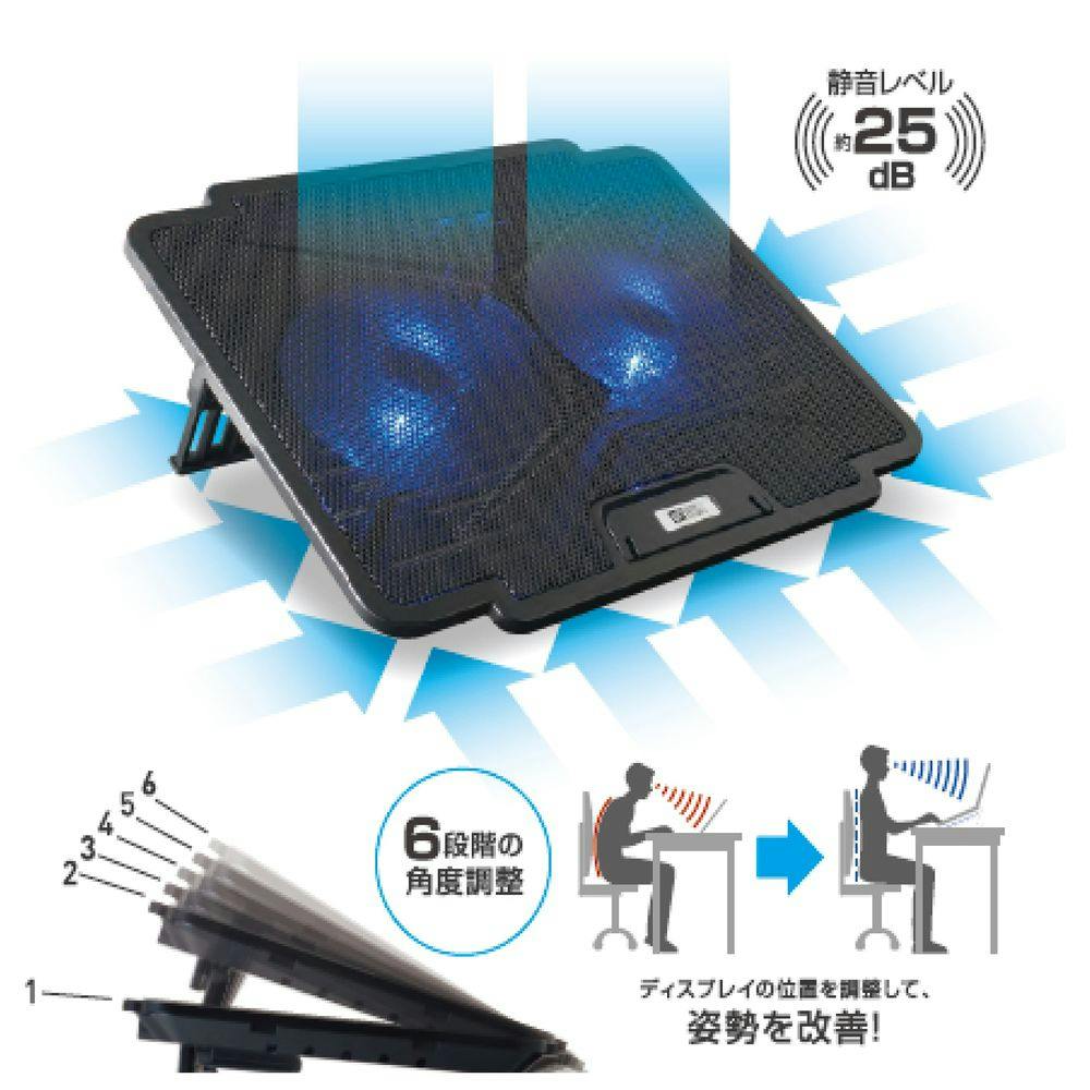● 無段階風量調整可能 ● 11.6〜15インチのノートPCに対応 ● 6段階角度調整が可能、ディスプレイの位置を調整して姿勢を改善します