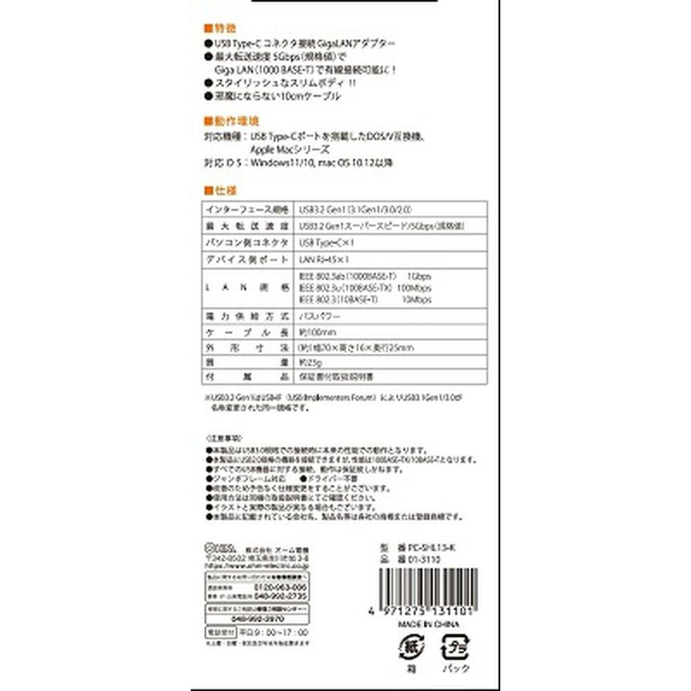 ● USB Typ-Cコネクタ搭載でGiga LANポートがないPCにも使用できます ● Giga LAN(RJ-45)×1ポート搭載 ● 高速 1000BASE-T 1Gbps対応のUSB接続有線LAN ● 最大転送速度5Gbps(規格値)