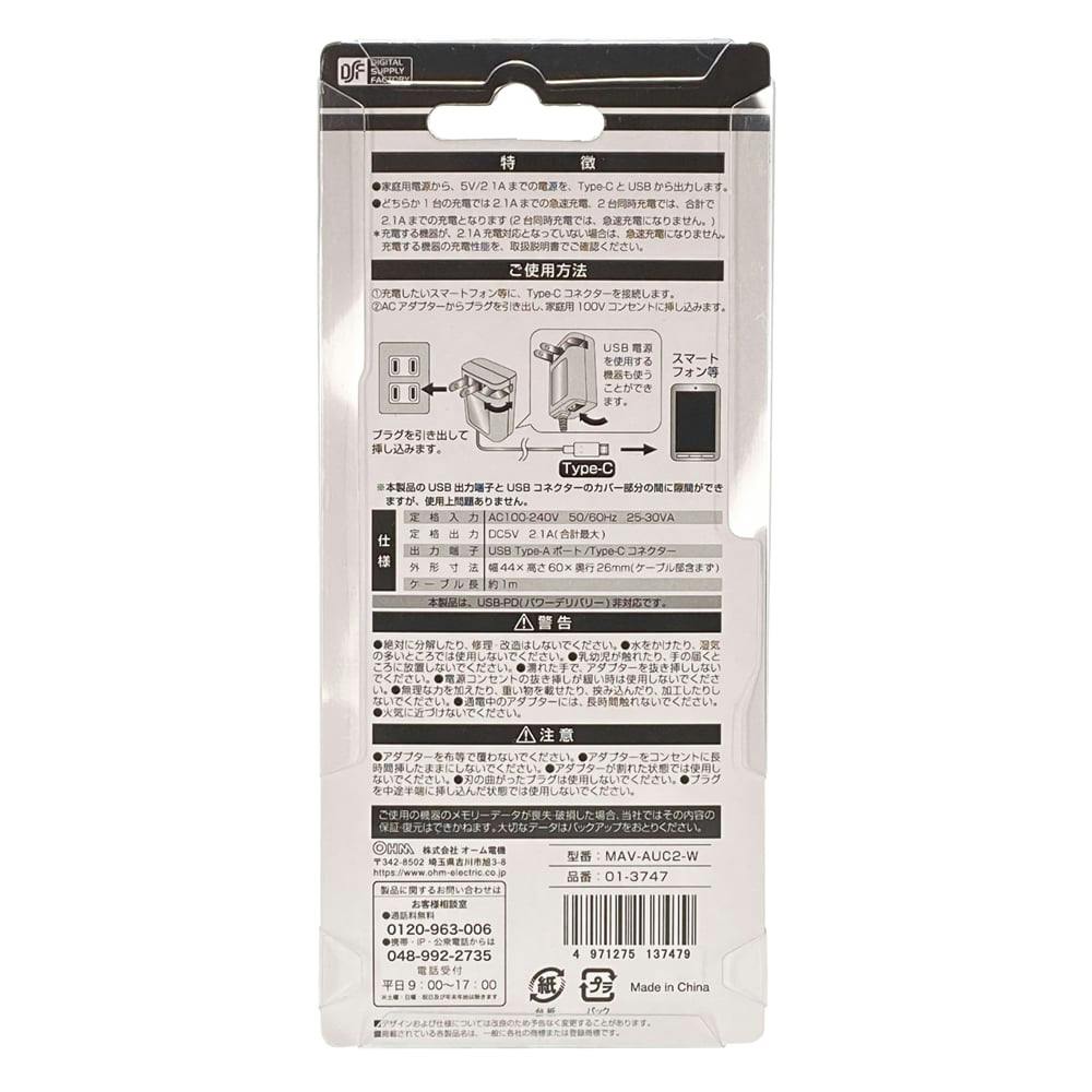 ACアダプター USB+TypeCケーブル 1m MAV-AUC2-W 01-3747