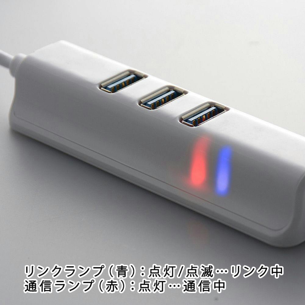 ● USB Type-Aコネクタ接続GigaLAN+USB3.2 Gen1×3ポートハブ ● 最大転送速度5Gbps(規格値)で大容量データも素早く転送 ● GigaLAN(1000BASE-T)で有線接続可能に