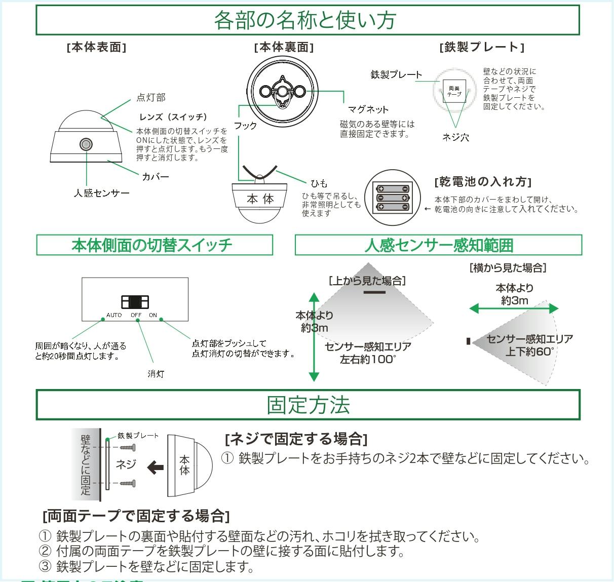 LEDプッシュライト センサー 明暗+人感 白色LED 電池式 BLA6JD-WN