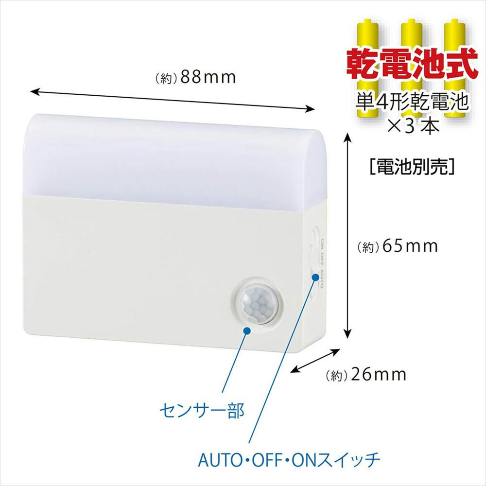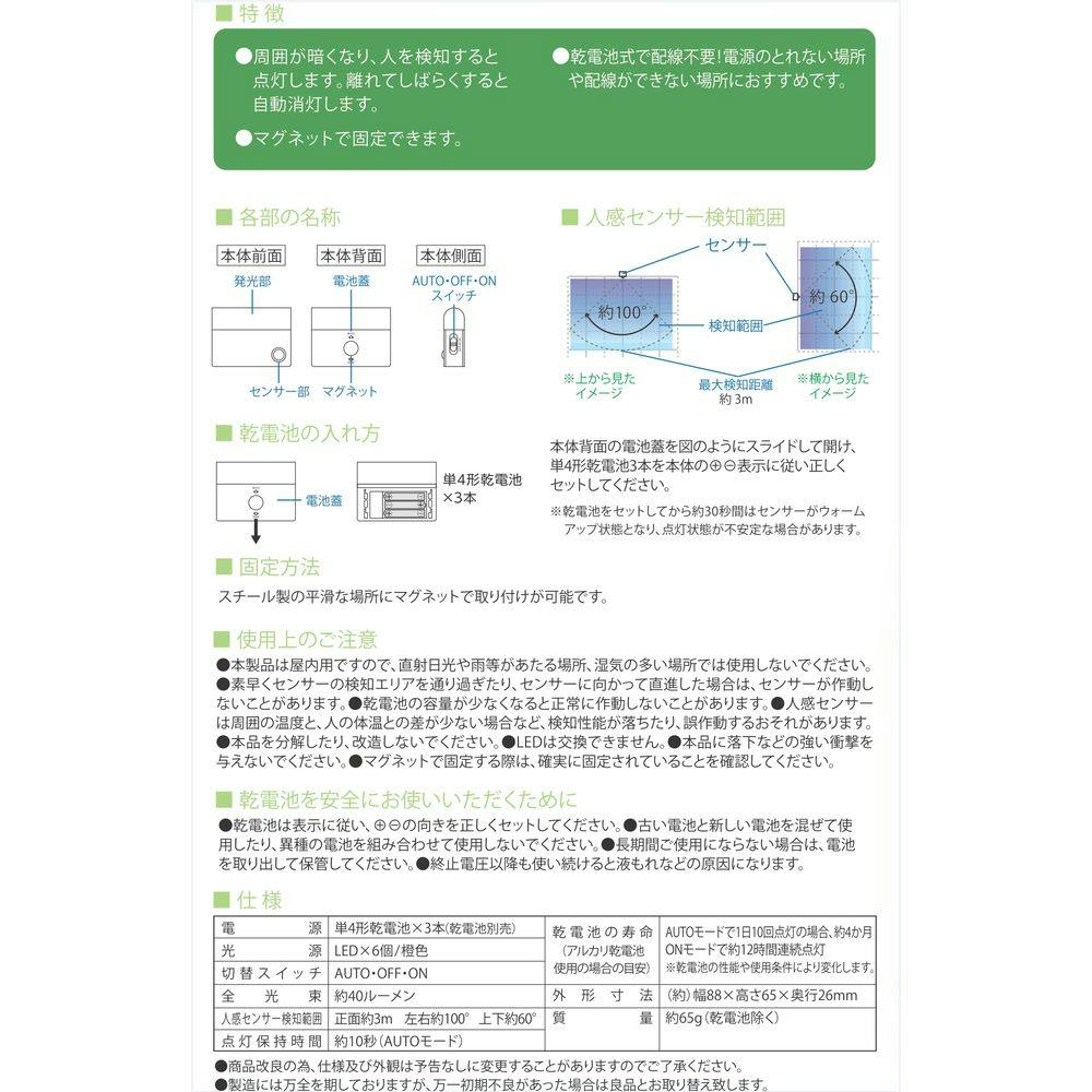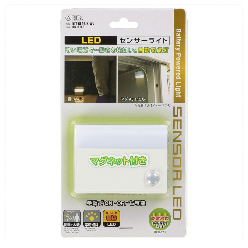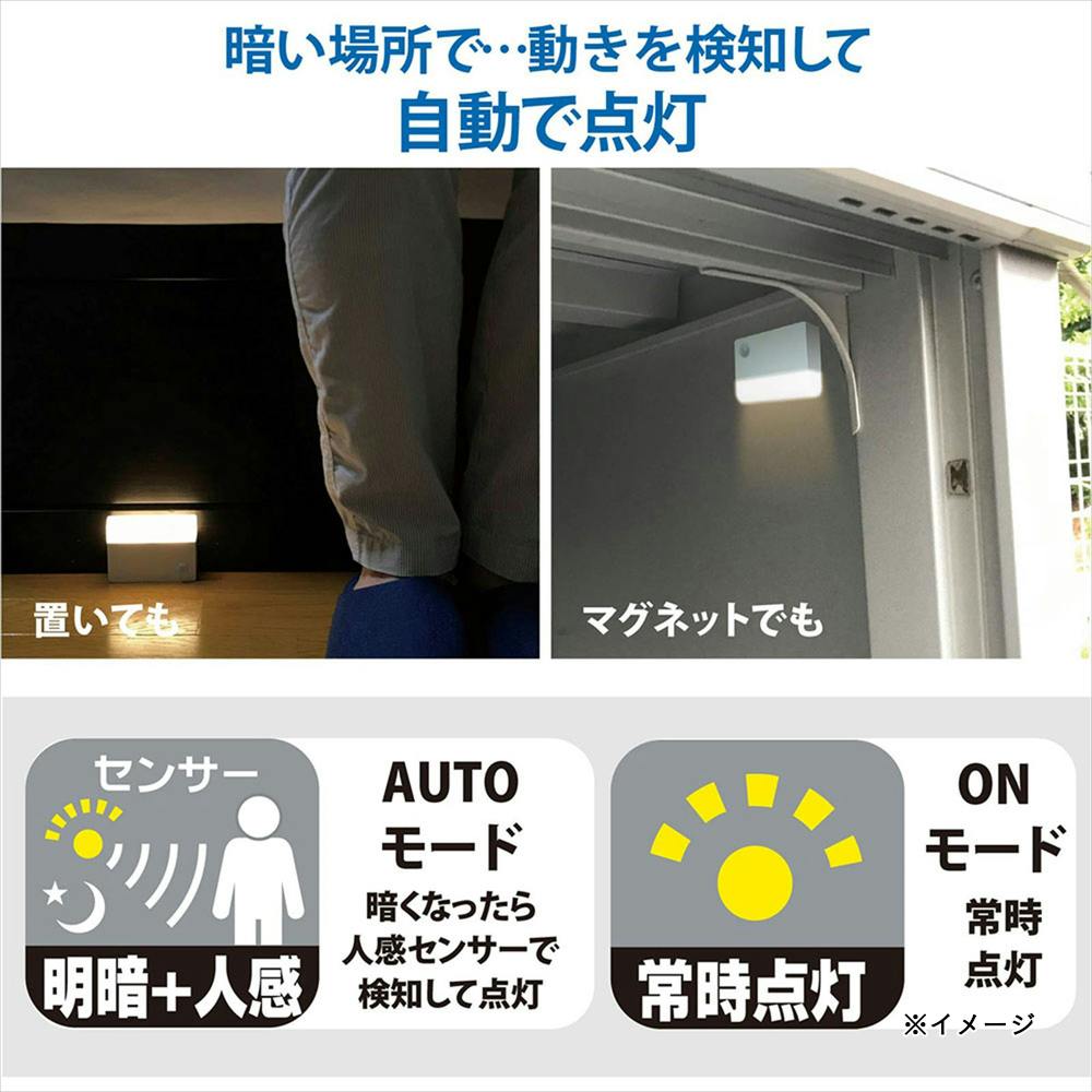 LEDセンサーライト 明暗+人感 屋内用 電池式 NIT-BLA6JK-WL 約40ルーメン 防犯 人感・明暗センサー 屋内用 壁面・床面設置 マグネット付き