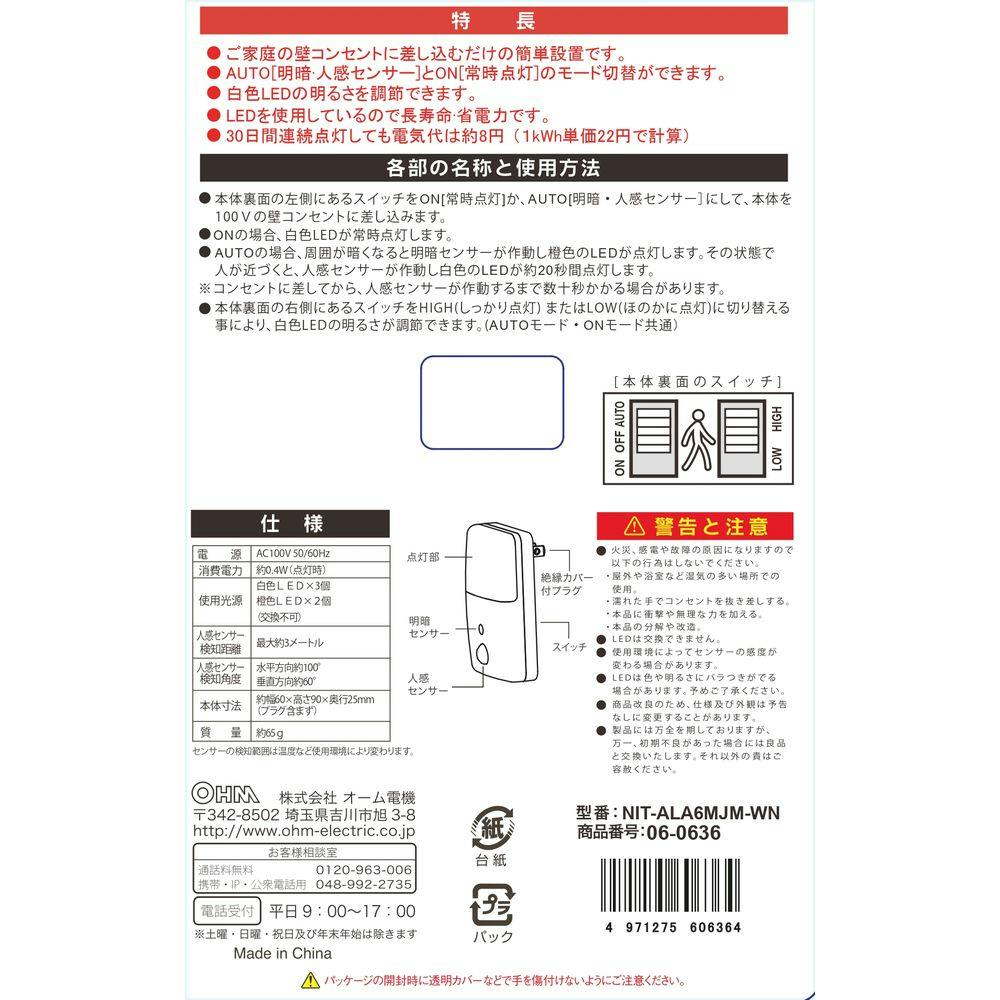 LEDナイトライト 明暗・人感センサー 橙色・白色2色 NIT-ALA-6MJM-WN 06-0636 防犯 人感・光センサー コンセント差し込み簡単設置