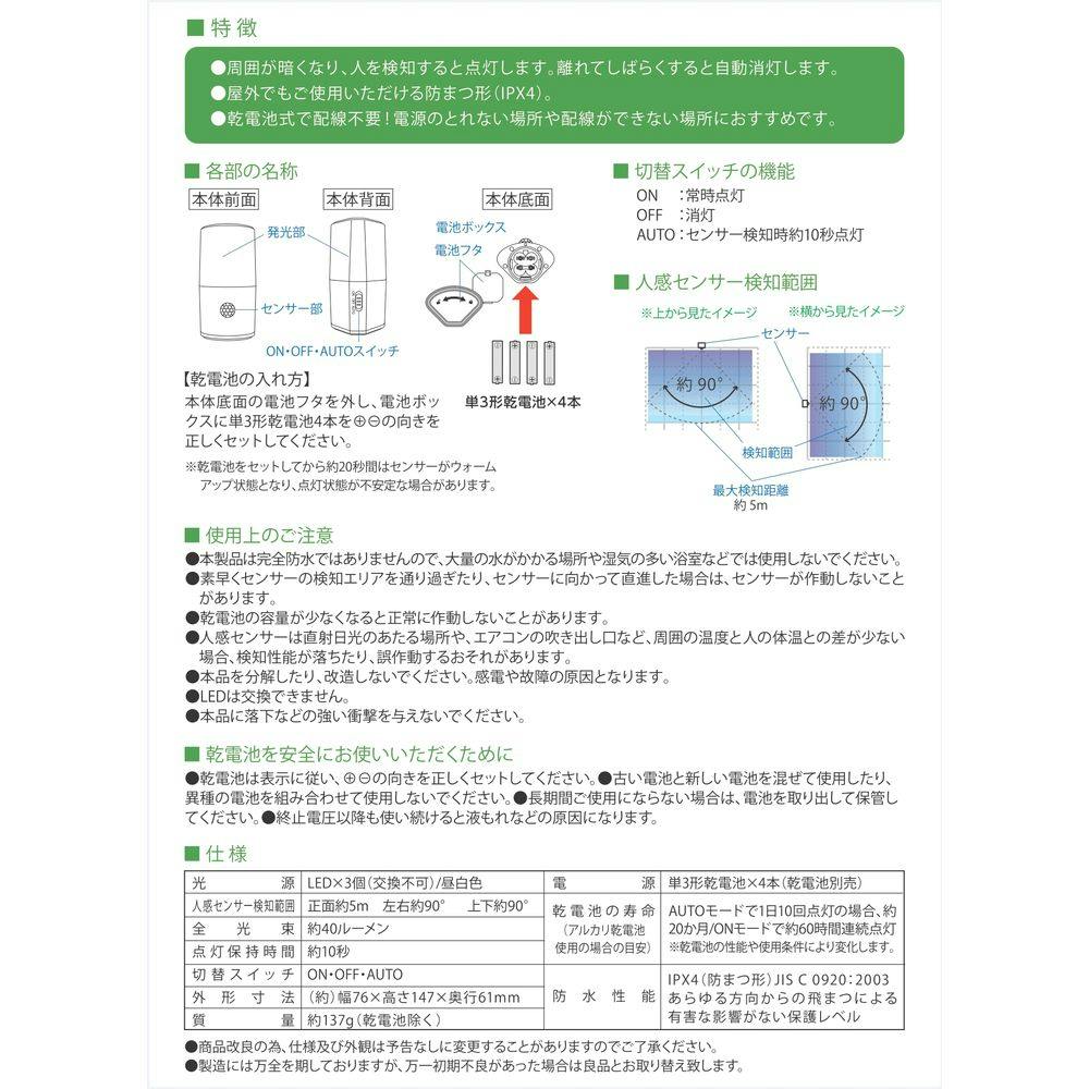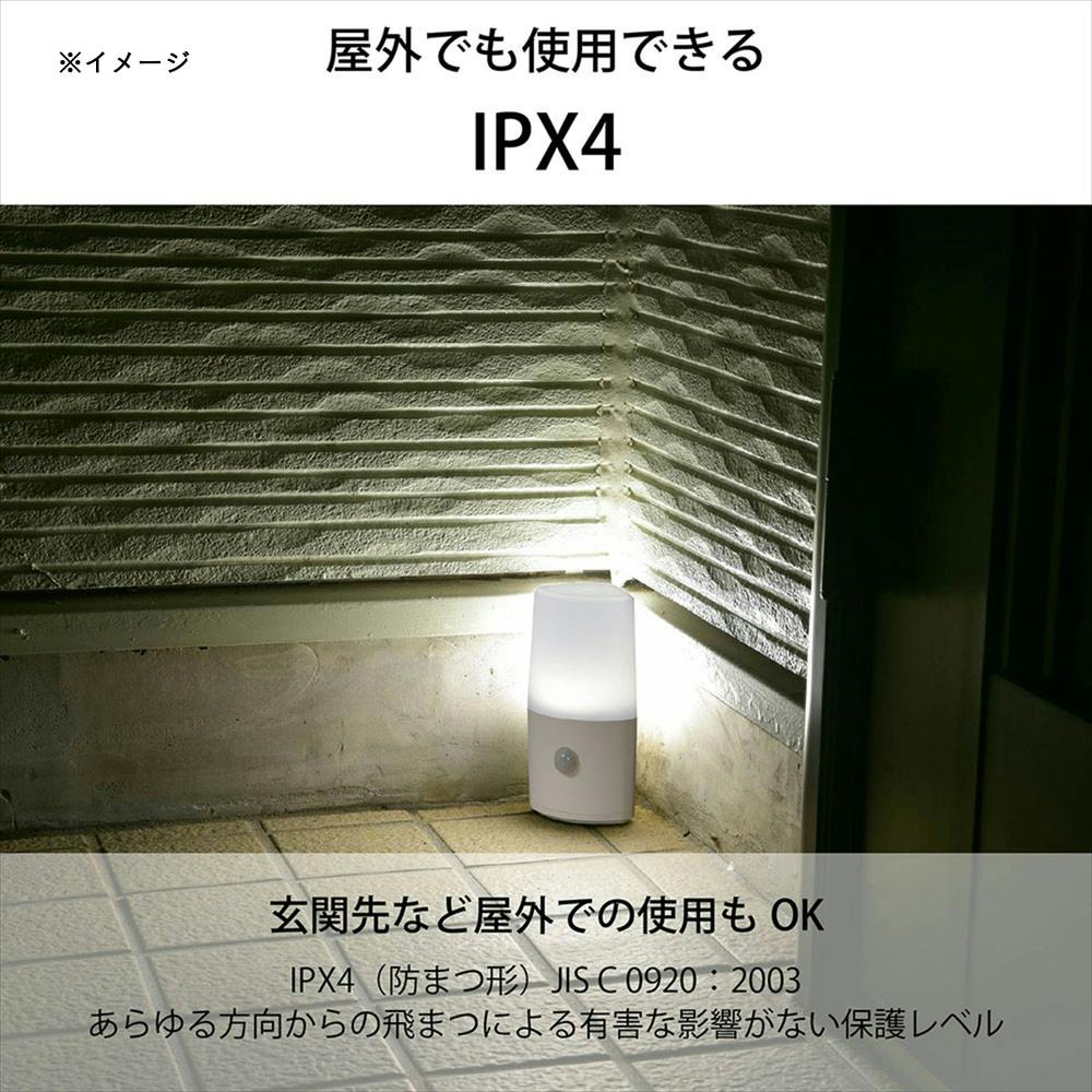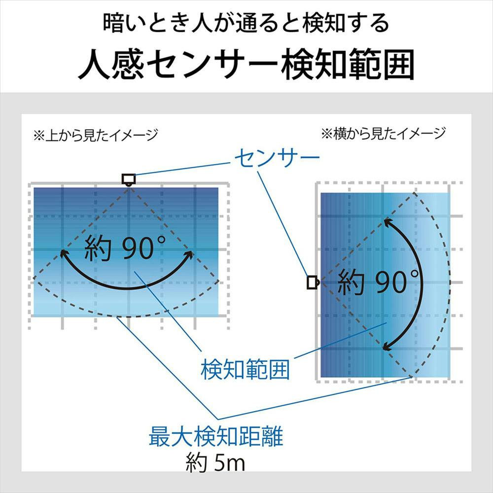 周囲が暗くなり人を検知すると点灯、離れてしばらくすると自動消灯、常時点灯モード搭載