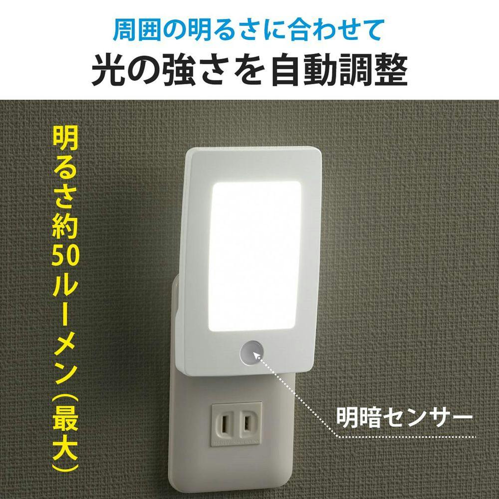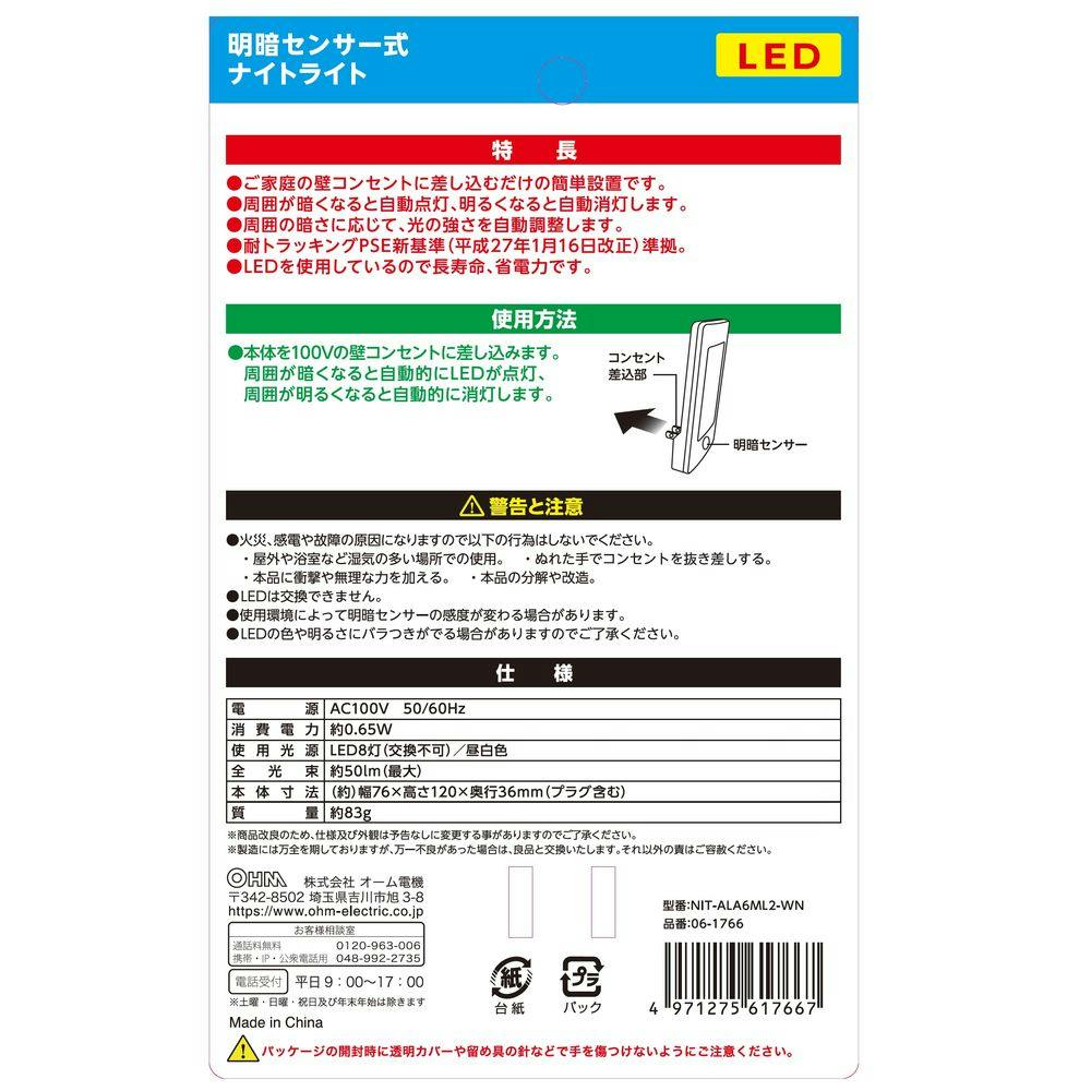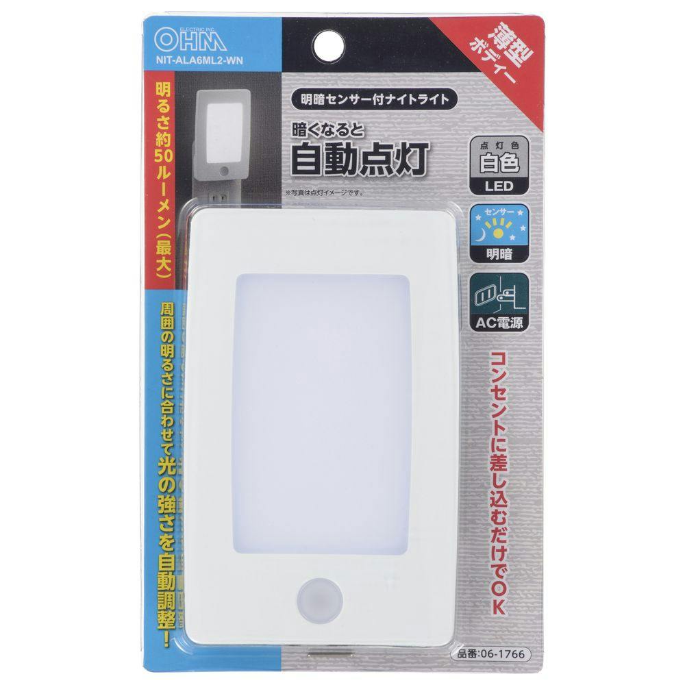 LEDナイトライト 明暗センサー 薄型 白色LED NIT-ALA6ML2-WN 06-1766 約50ルーメン 防犯 コンセント差し込み簡単設置