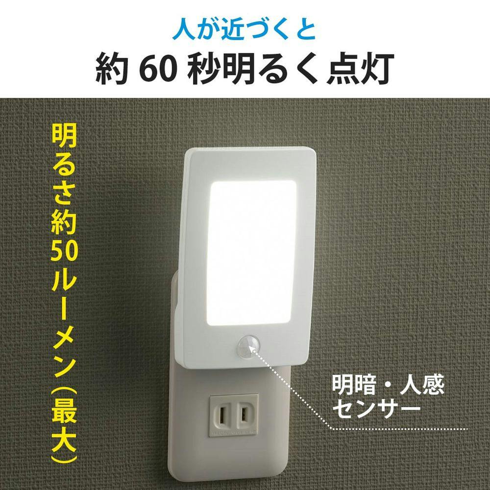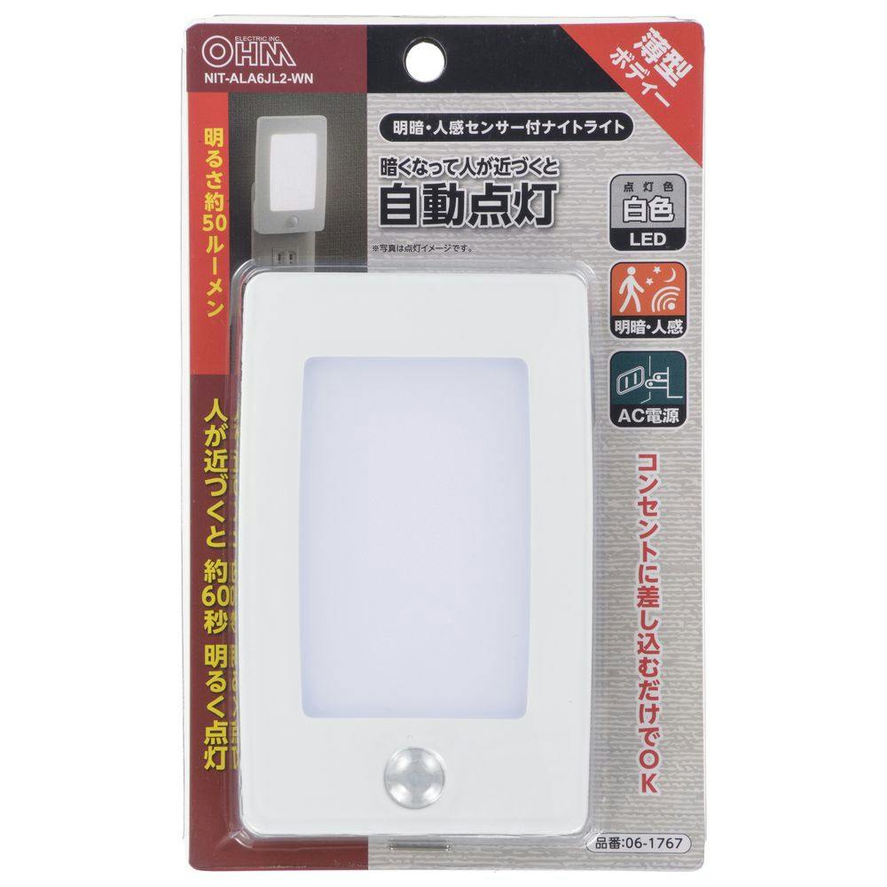 LEDナイトライト 明暗・人感センサー 薄型 白色 NIT-ALA6JL2-WN 約50ルーメン 防犯 明暗・人感センサー コンセント差し込み簡単設置