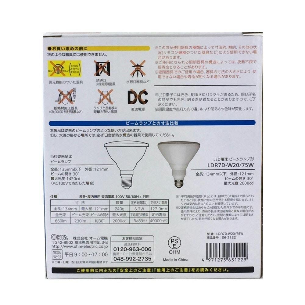LED電球 ビームランプ形 E26 75形相当 6.7W 昼光色 散光形 屋内・屋外兼用 E-Bright LDR7D-W20/75W