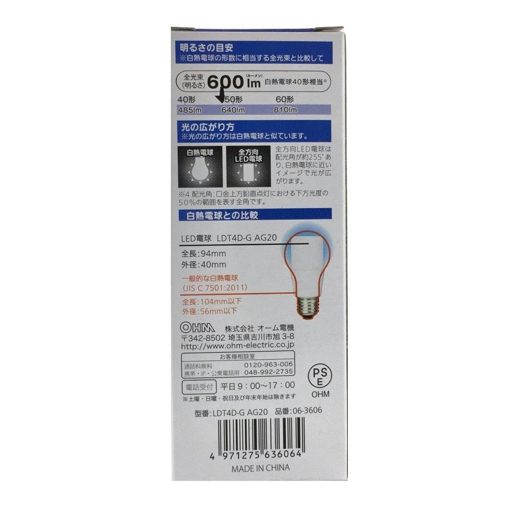 LED電球 T形 E26 40形相当 昼光色 LDT4D-G AG20 06-3606
