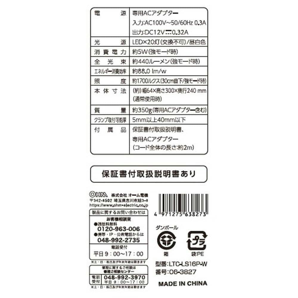 LEDデスクランプ クランプタイプ 昼白色 ホワイト LTC-LS16P-W 06-3827
