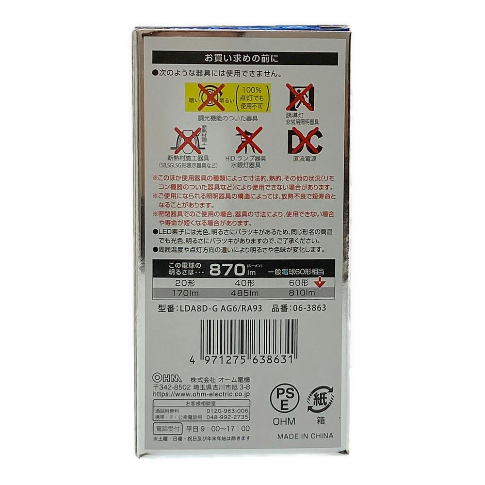 LED電球 E26 60形相当 昼光色 LDA8DGAG6RA93