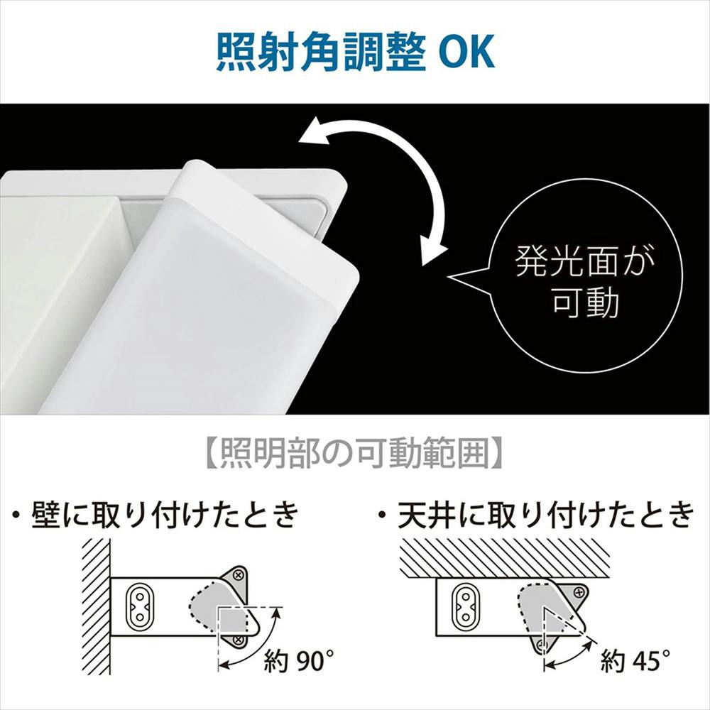 使用場所:屋内、面発光の広配光タイプで発光面が可動します、壁に取り付け時は最大90°、天井に取り付け時は最大45°照射角が調整できます