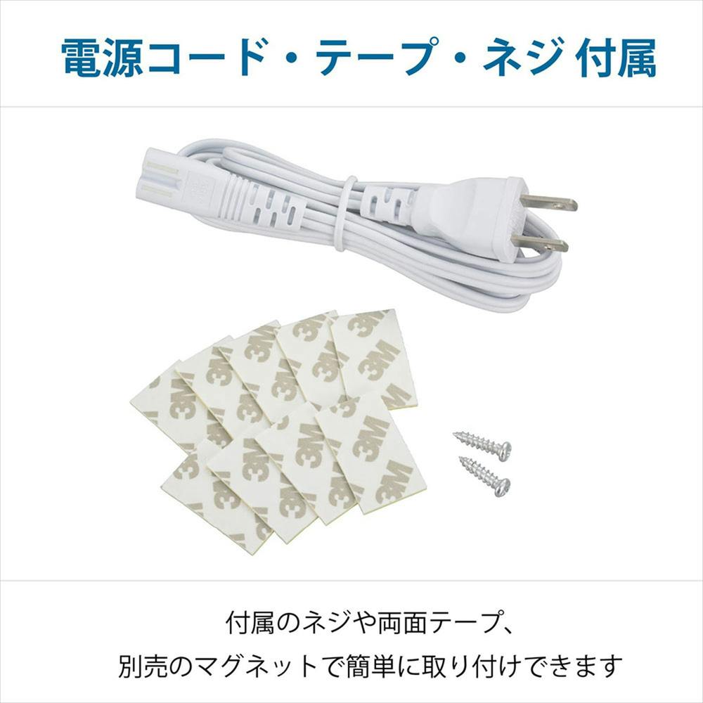 固定用ネジ×2本、電源コード約1.4m×1本、固定用両面テープ×9枚、サイドキャップ※本体に装着済み、保証書付取扱説明書