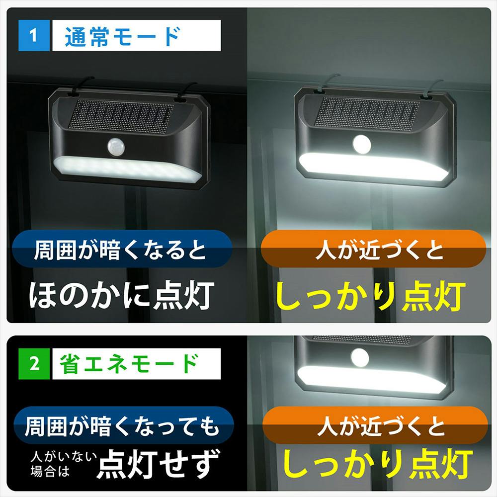選べる2つのモード ・ 周囲が暗くなるとほのかに点灯、動きを検知するとしっかり点灯モード(通常モード) ・ 周囲が暗くなっても点灯せず、動きを検知した時だけしっかり点灯モード(省エネモード)