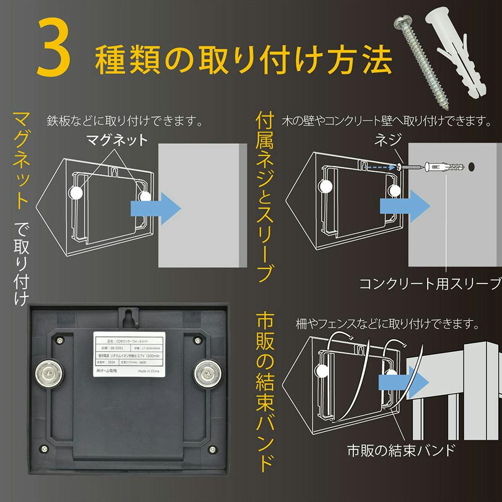 3種類の取り付け方法 ・ マグネットで鉄板などに ・ 付属のネジとスリーブで木の壁やコンクリート壁へ ・ 市販の結束バンドで柵やフェンスなどに