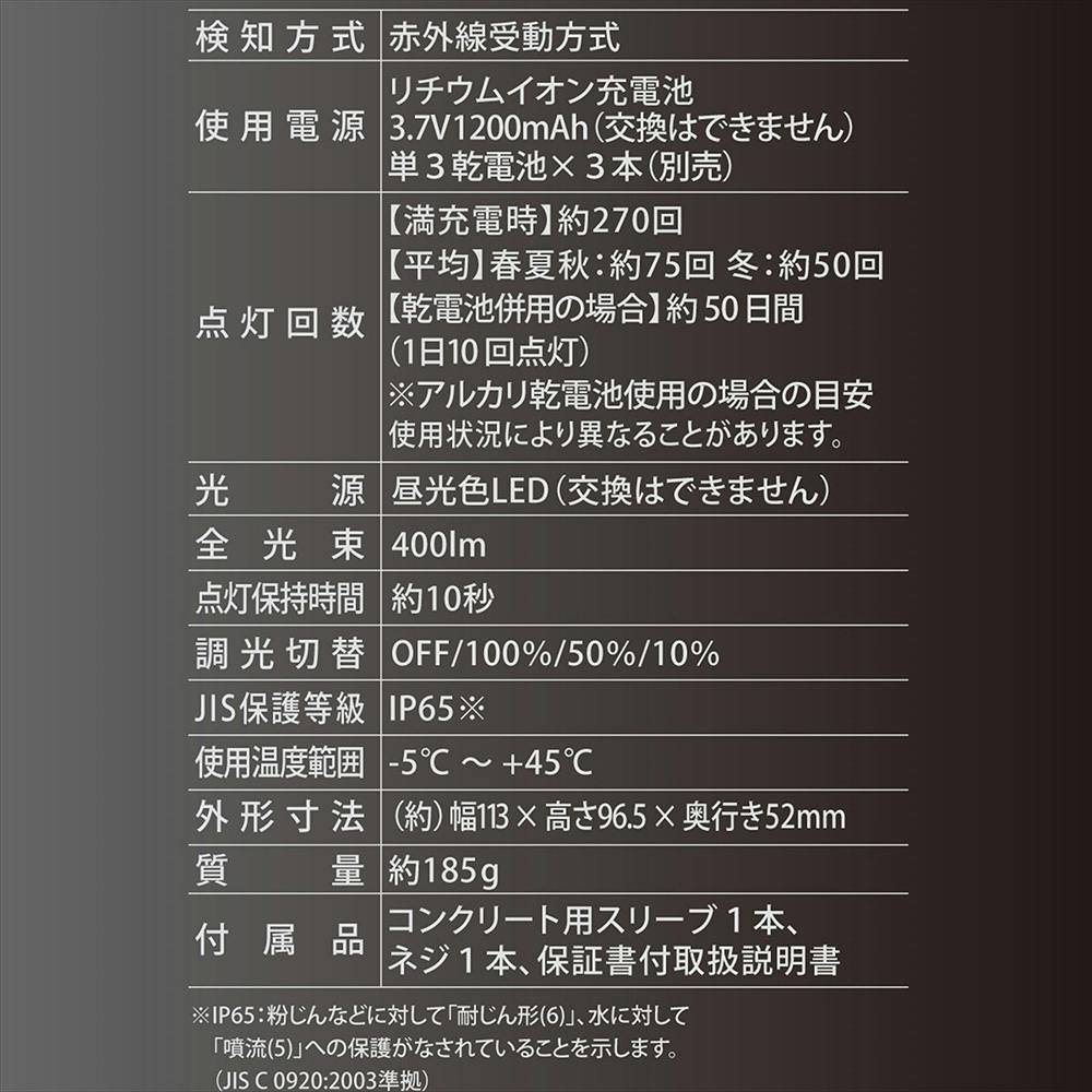 ・ 満充電時…約270回 ・ 平均…春夏秋/約75回、冬/約50回 ・ 乾電池併用の場合…約50日間(1日10回点灯)※アルカリ乾電池使用の場合