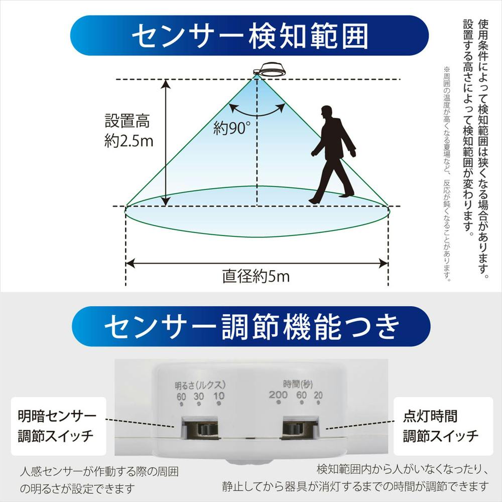周囲が暗くなり人が近づくと点灯する、明暗・人感センサー付き ● 周囲が明るいときには点灯しません