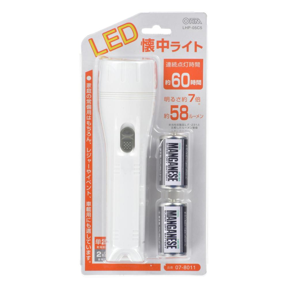 LED懐中ライト 58ルーメン 単2形乾電池2本付き LHP-05C5 07-8011