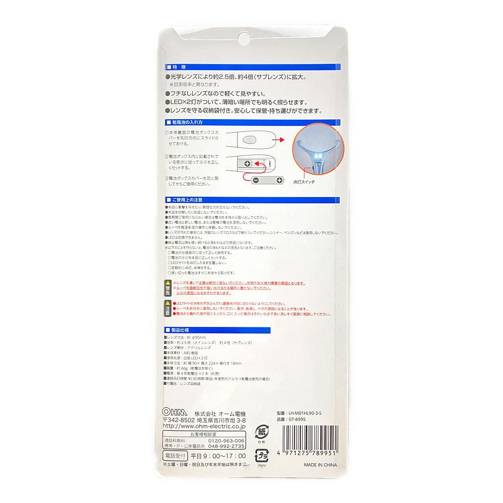 ●光学レンズにより約2.5倍、約4倍(サブレンズ)に拡大。※目測倍率と異なります。●フチなしレンズなので軽くて見やすい。●LED×2灯がついて、薄暗い場所でも明るく照らせます。●レンズを守る収納袋付き。安心して保管・持ち運びができます。