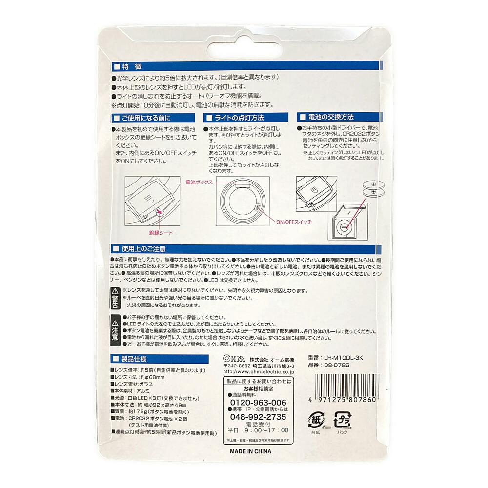 ●光学レンズにより約5倍に拡大されます。(目測倍率と異なります。)●本体上部のレンズを押すとLEDが点灯/消灯します。●ライトの消し忘れを防止するオートパワーオフ機能を搭載。※点灯開始10分後に自動消灯し、電池の無駄な消耗を防ぎます。