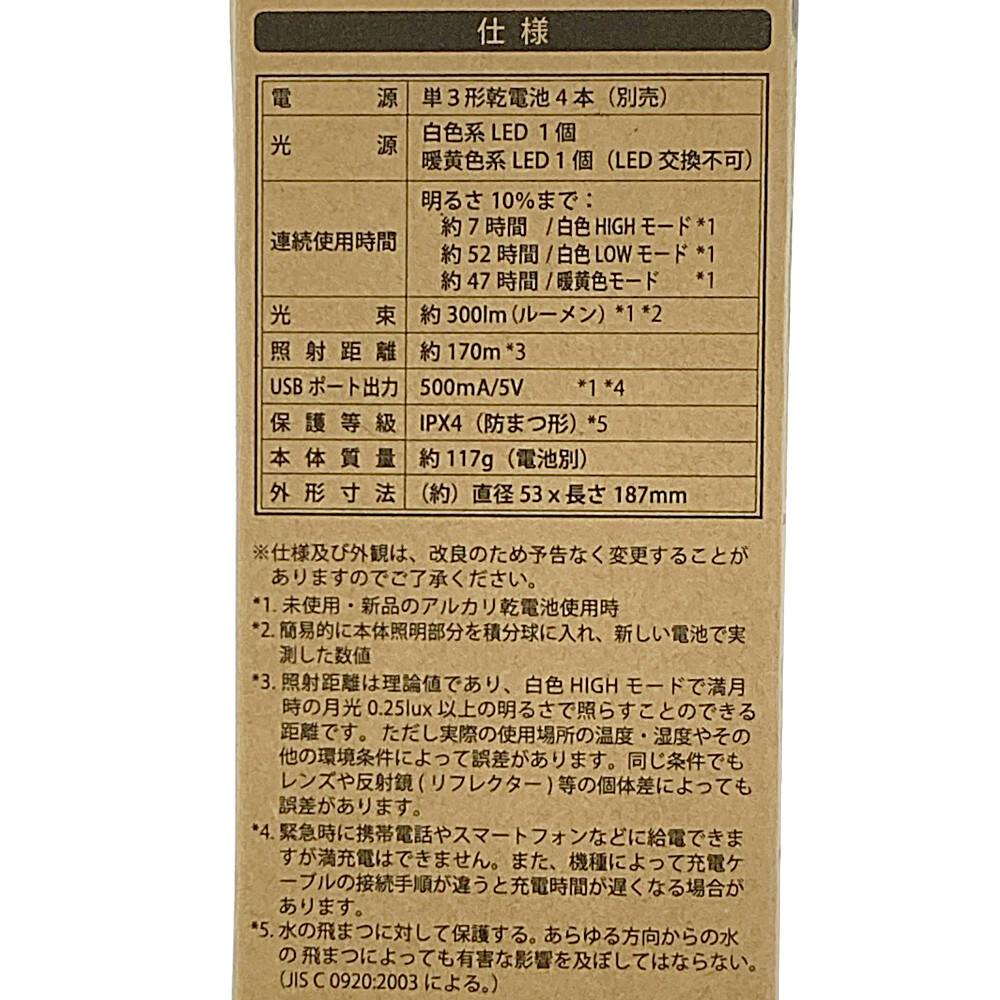 約7時間(白色HIGHモード)、約52時間(白色LOWモード)、約47時間(暖黄色モード)