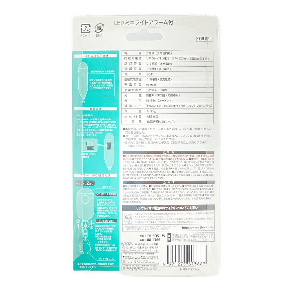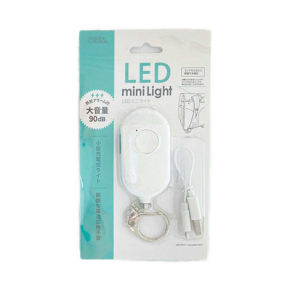 防犯ブザー 防犯アラーム付きLEDミニライト 充電式 大音量90dB KH-SOS1-W