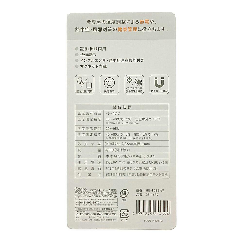 温度が見やすい温湿度計 健康サポート機能付き ホワイト HB-T03B-W