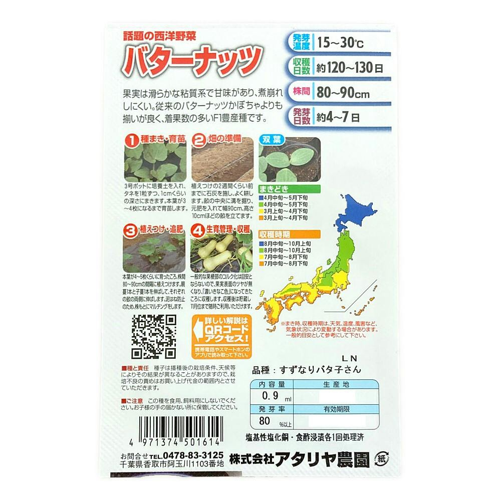 ●発芽温度/15~30℃●収穫日数/約120~130日●株間/80~90cm●発芽日数/約4~7日●話題の西洋野菜●果実は滑らかな粘質系で甘味があり、煮崩れしにくい。●従来のバターナッツかぼちゃよりも揃いが良く、着果数の多いF1豊産種です。●使い切りサイズで収量性・貯蔵性が抜群