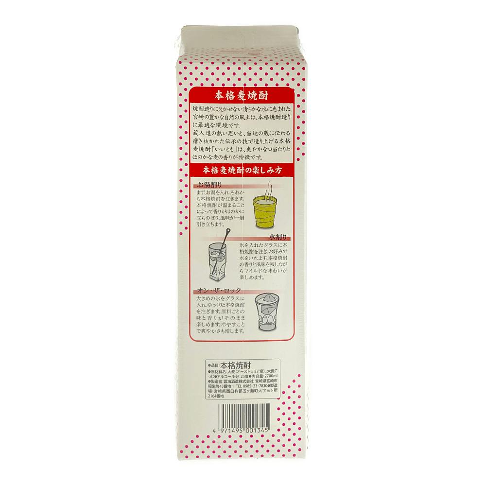 ●本格麦焼酎●焼酎造りに欠かせない清らかな水に恵まれた宮崎の豊かな自然の風土は、本格焼酎造りに最適な環境です。●蔵人達の熱い思いと、当地の蔵に伝わる抜かれた伝承の技で造り上げる本格麦焼酎「いいとも」は、爽やかな口当たりとほのかな麦の香りが特徴です。