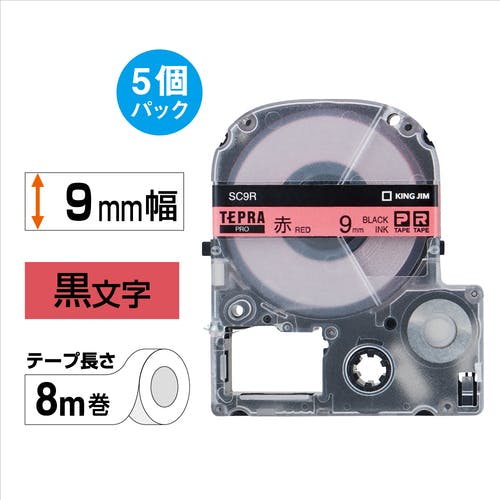 【CAINZ-DASH】キングジム 【純正】「テプラ」PROテープ 9mm エコパック(5個入り)/赤ラベル/黒文字 長さ8m SC9R-5P【別送品】
