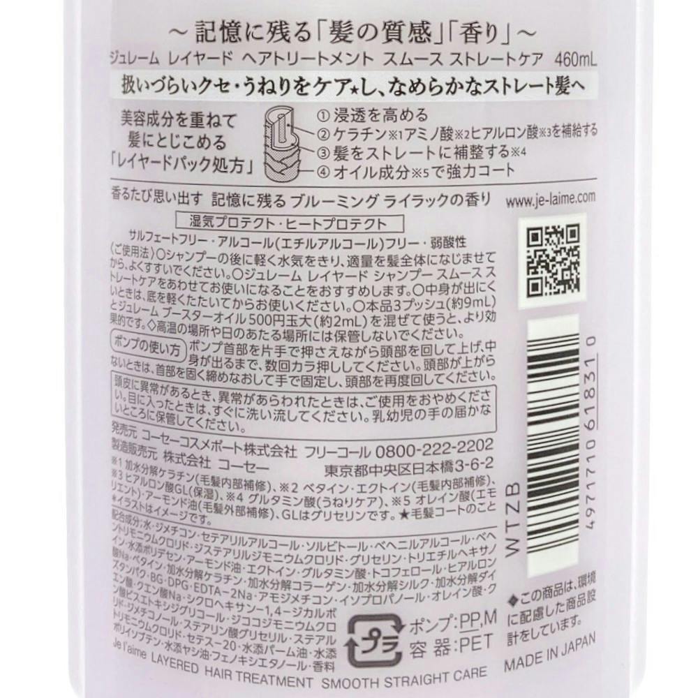 ●シャンプーの後に軽く水気をきり、適量を髪全体になじませてから、よくすすいでください。●ジュレーム レイヤード シャンプー スムース ストレートケアをあわせてお使いになることをおすすめします。など