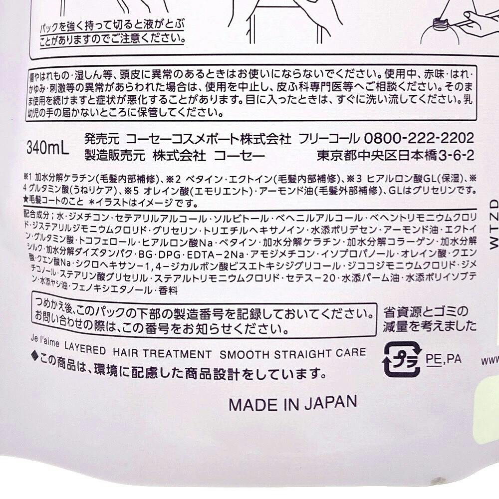 ●シャンプーの後に軽く水気をきり、適量を髪全体になじませてから、よくすすいでください。●ジュレーム レイヤード シャンプー スムース ストレートケアをあわせてお使いになることをおすすめします。など