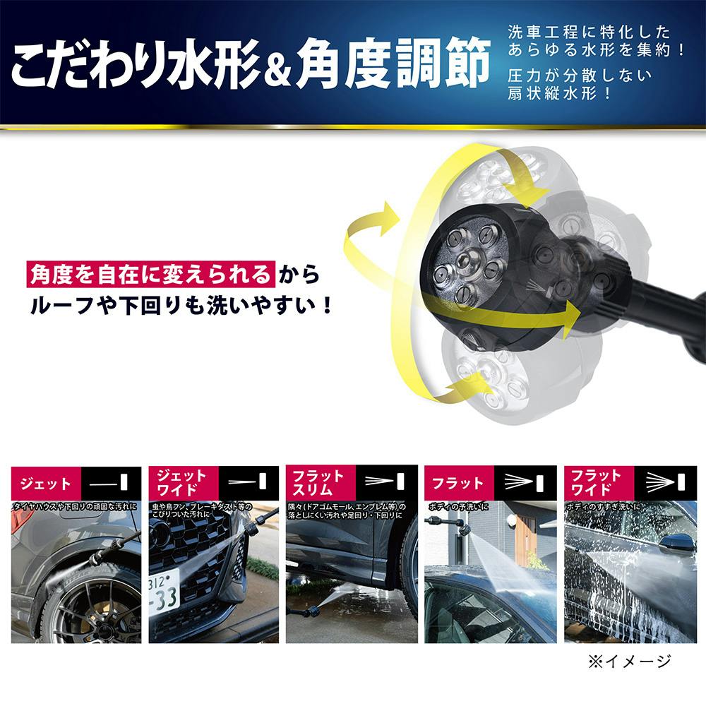 ●洗車に特化した5つの水形●先端は角度調節可能●静音タイプ●標準で8mのしなやか高圧ホース付き。