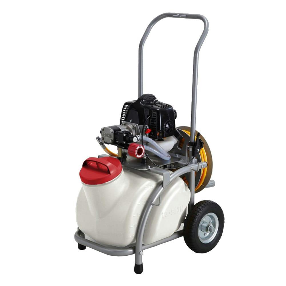 高木への散布に直射ができる鉄砲ノズルを付属。25Lタンク・キャリー一体型なのであとは薬液を準備するだけ。