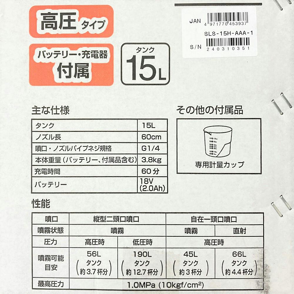 タンク:15L / バッテリー:18V2.0Ah