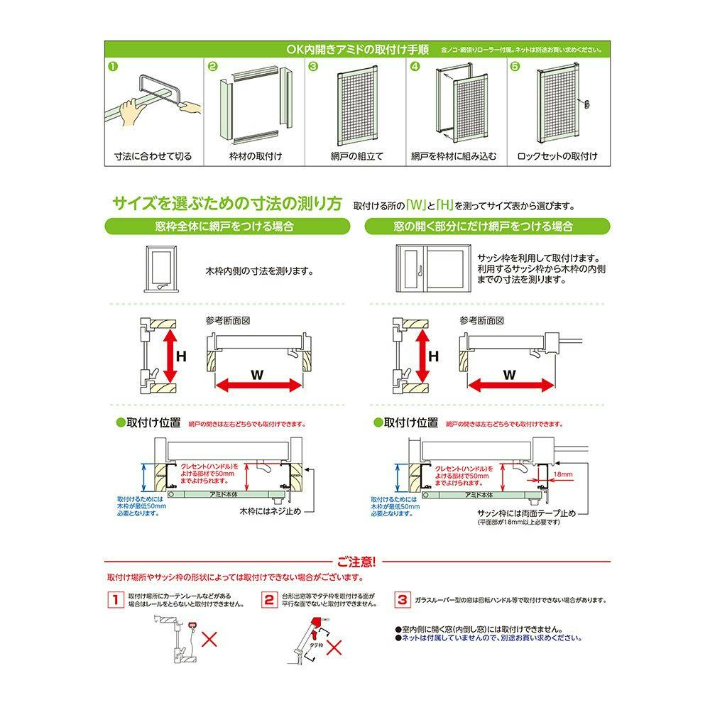●室内側に開く窓(内倒し窓)には取付けできません。●ネットは付属していませんので、別途お買い求めください。●最小制作寸法は高さ幅ともに20cmとなります。