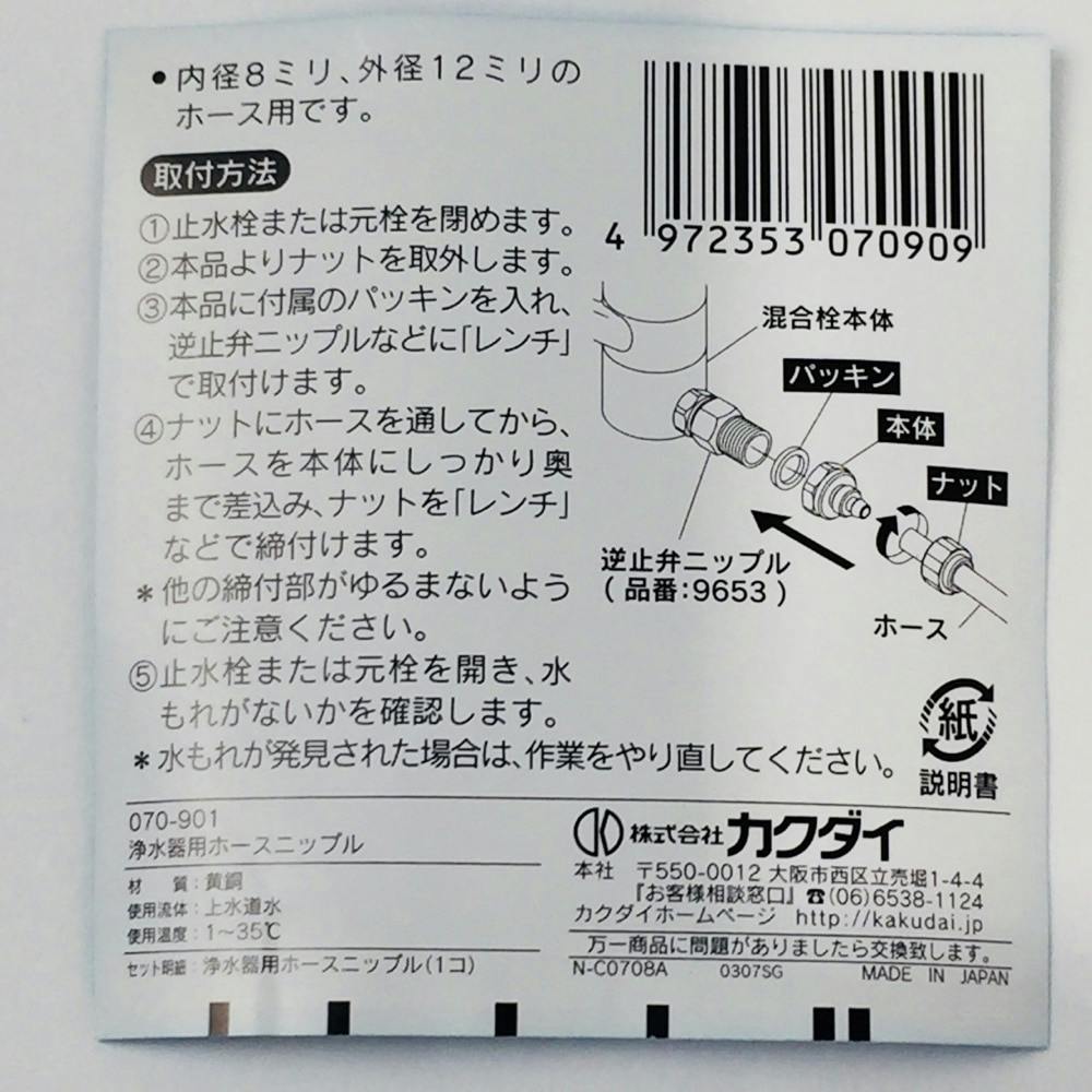 適用ホース径(外径×内径):12×8ミリの浄水器用のホースニップルです