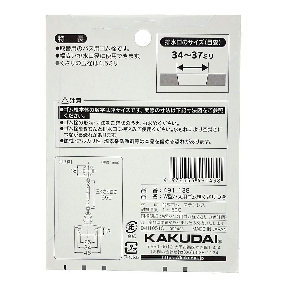 W型バス用ゴム栓くさり付 排水口径 34~37mm用 491-138