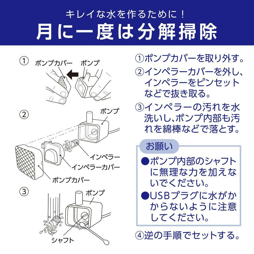 ポンプ内部のお手入れ1.ポンプカバーを取り外す。2.インペラーカバーを外し、インペラーを取り外す。3.インペラーの汚れを水洗いし、ポンプ内部も汚れを綿棒等で落とす。