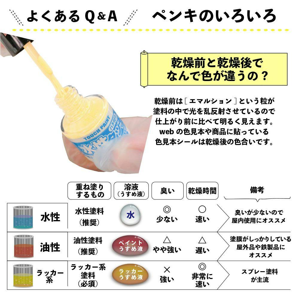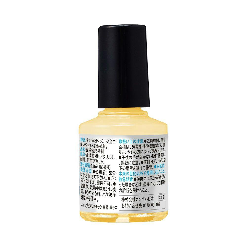 刷毛付きでそのまま手軽に塗れる「マニュキュアタイプ」だから補修・ホビーなどの部分塗りにぴったりです。臭いが少なく、乾燥が速く、塗りやすい水性塗料です。 ※水性でも乾燥すると水で流れ落ちることはありません。
