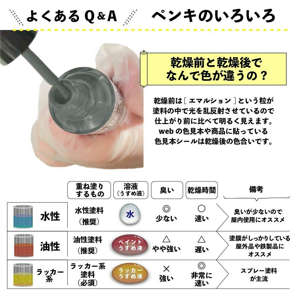 刷毛付きでそのまま手軽に塗れる「マニュキュアタイプ」だから補修・ホビーなどの部分塗りにぴったりです。エナメル調の美しいツヤに仕上がり、光沢が長期間持続する油性塗料です。 ※水性でも乾燥すると水で流れ落ちることはありません。