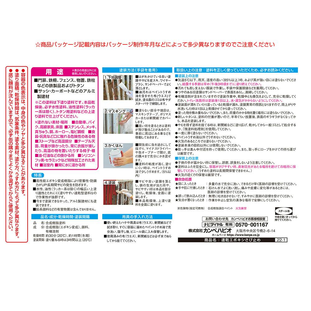防サビ顔料とエポキシ樹脂により密着性・防錆力がUPします。長期間サビの発生を防ぎます。たれにくく塗りやすい速乾型塗料なので作業性が抜群です。今まで塗装できなかった、アルミ製品にも塗装できます。鉛系顔料などの有害物質は含んでおりません。