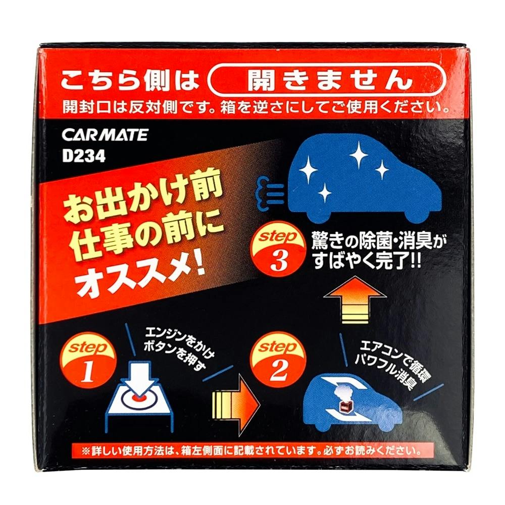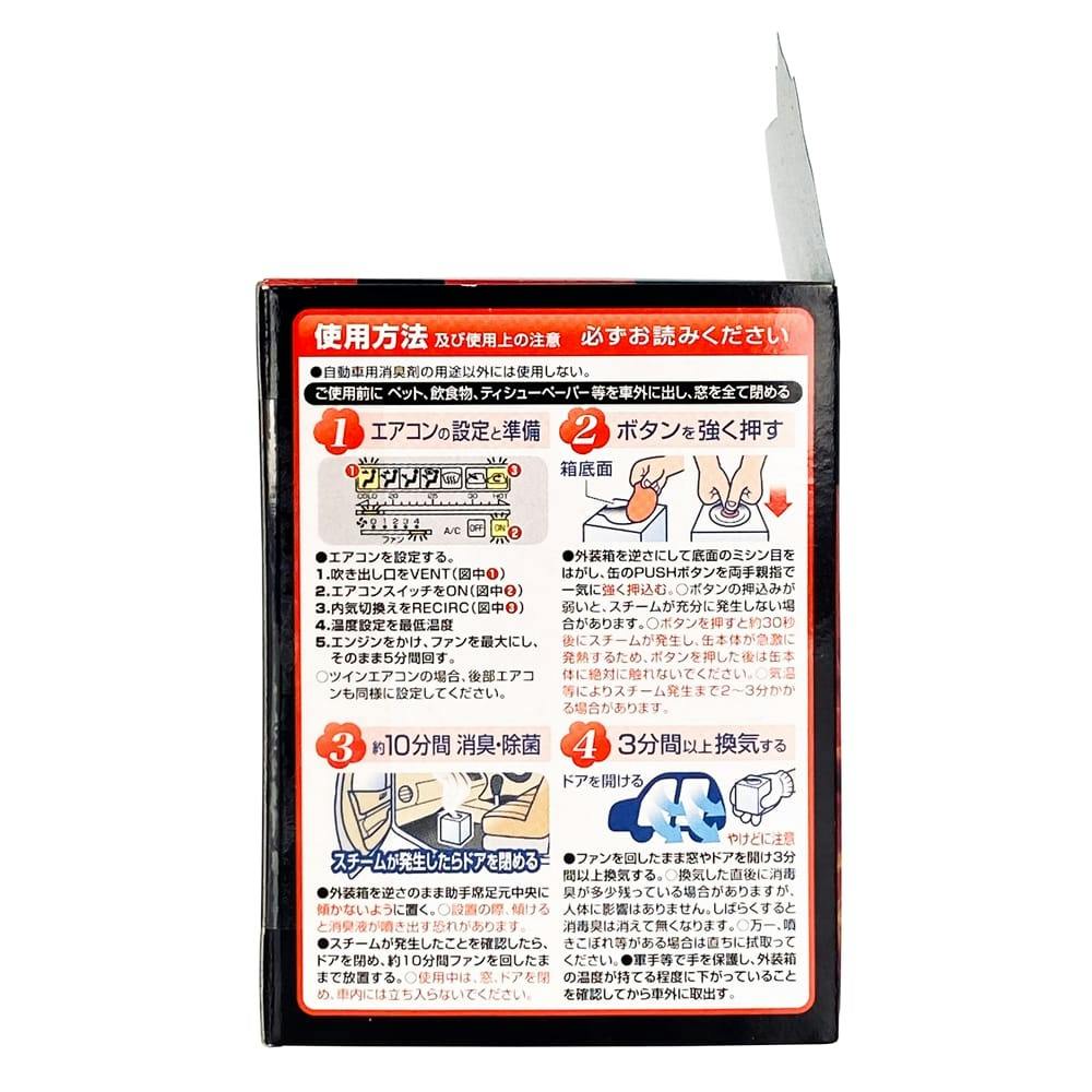 自動車用消臭剤の用途以外には使用しない。ご使用前に、ペット、飲食物、ティッシュペーパー等を車外に出し、窓を全て閉める