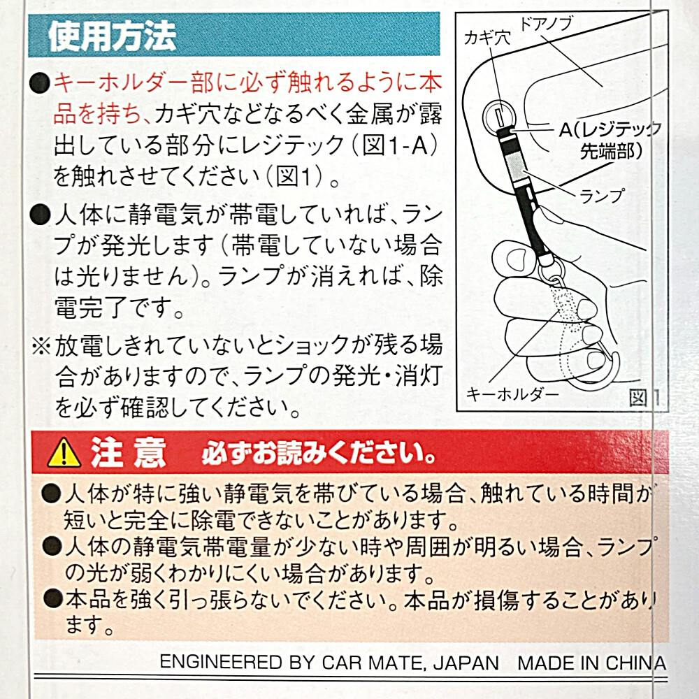 使用方法/●キーホルダー部に必ず触れるように本品を持ち、カギ穴などなるべく金属が露出している部分にレジテックを触れさせてください。●人体に静電気が帯電していればランプが発光します(帯電していない場合は光りません)ランプが消えれば除電完了です。